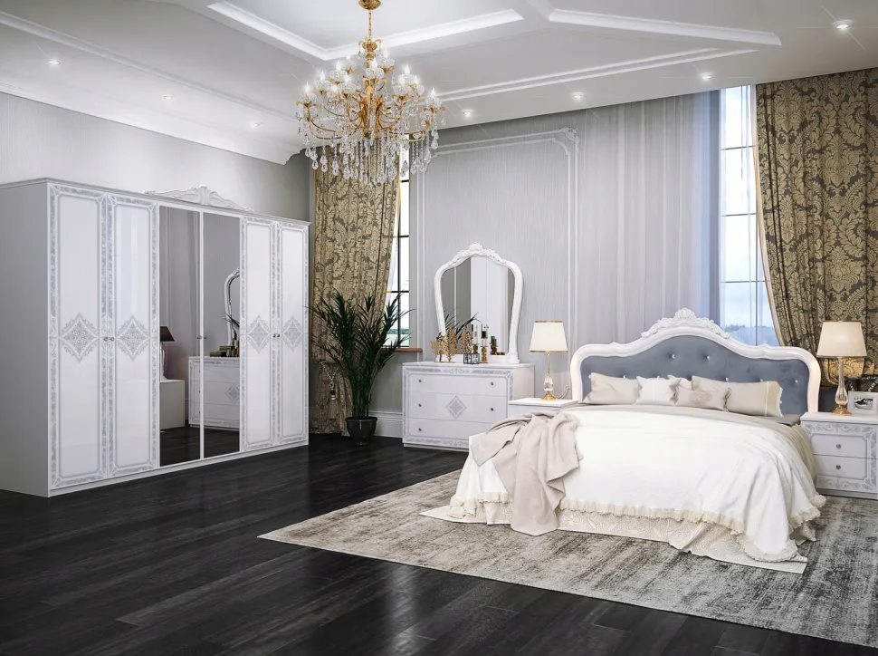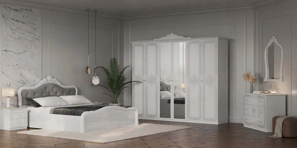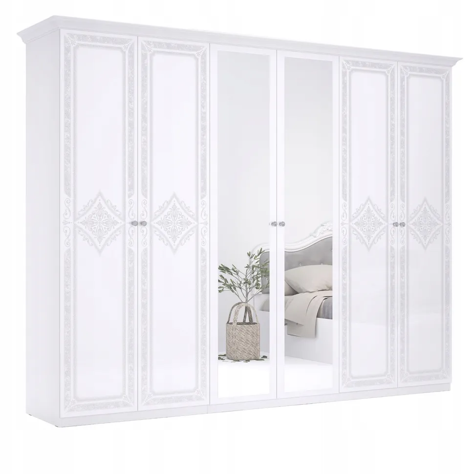 Szafa Diamante 281cm w kolorze białym to mebel, który łączy w sobie funkcjonalność i estetykę. Jej klasyczny design z 6 drzwiami, w tym z lustrem i sitodrukiem na frontach, nadaje pomieszczeniu elegancji i stylu. To doskonałe rozwiązanie dla osób poszukujących praktycznego i atrakcyjnego elementu do swojej sypialni czy przedpokoju.