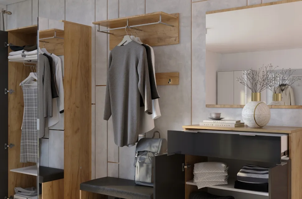 Szafa Lana 60cm dąb/szary to niezwykle funkcjonalny mebel, który doskonale sprawdzi się w każdym przedpokoju. Charakteryzuje się minimalistycznym designem, który harmonijnie wpisuje się w nowoczesne wnętrza, podążając za najnowszymi trendami aranżacyjnymi. Kontrastowe barwy – dąb i szary – tworzą elegancki i stonowany duet, który nadaje pomieszczeniu wyjątkowego charakteru.