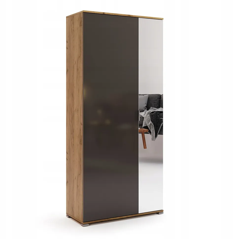 Jego klasyczne barwy – dąb i szary – tworzą harmonijny, zgrany duet, który dodaje elegancji i subtelności całej kompozycji. Fronty szafy, wykonane z wysokiej jakości płyty wiórowej laminowanej, charakteryzują się delikatnym połyskiem, który nadaje meblowi wyjątkowego blasku. We wnętrzu szafy znajdują się praktyczne półki i drążek, które pozwalają na wyeksponowanie ulubionych dodatków i organizację przechowywanych przedmiotów. Dzięki nim, szafa nie tylko doskonale uzupełnia wnętrze, ale także spełnia funkcję praktycznego rozwiązania do przechowywania odzieży, butów i innych akcesoriów.