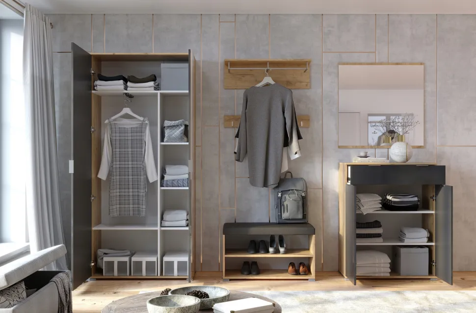 - Różnorodne przestrzenie wewnątrz szafy umożliwiają przechowywanie różnorodnych przedmiotów, od butów po akcesoria
