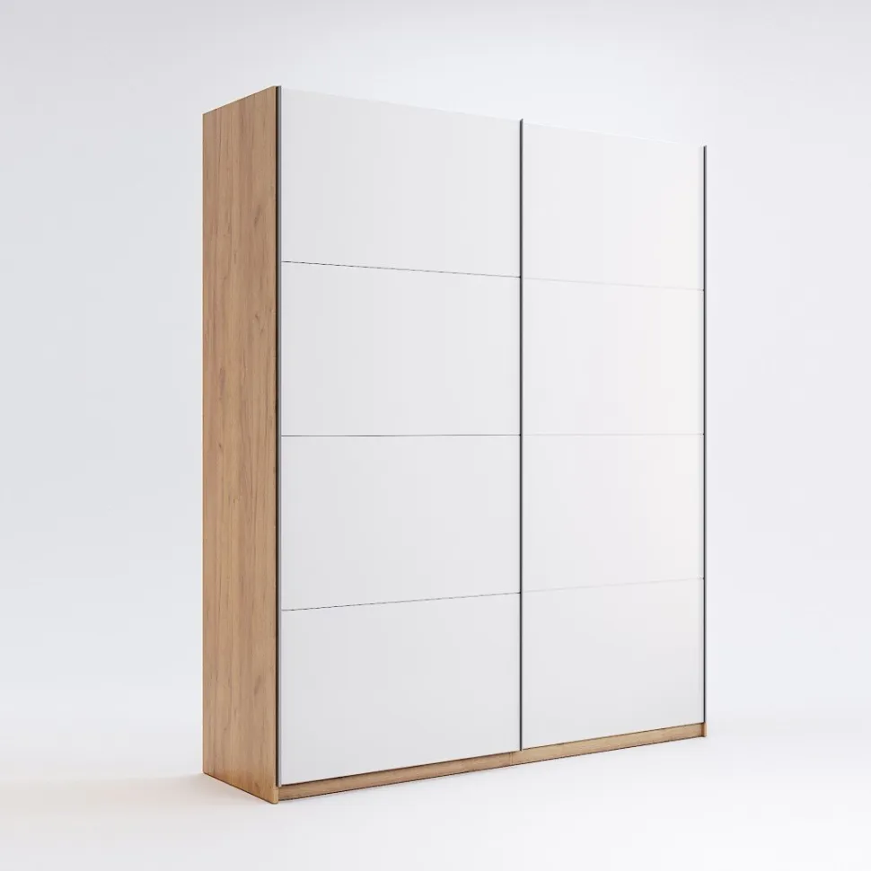 Szafa przesuwna Tissa o szerokości 150 cm, w wykończeniu dąb craft/biały połysk, prezentuje się jako wyjątkowe rozwiązanie dla nowoczesnych wnętrz, wyróżniając się minimalistycznym stylem. Kontrastowe barwy oraz białe drzwi z połyskiem dodają elegancji, tworząc harmonijny duet, który doskonale komponuje się w przestrzeni.