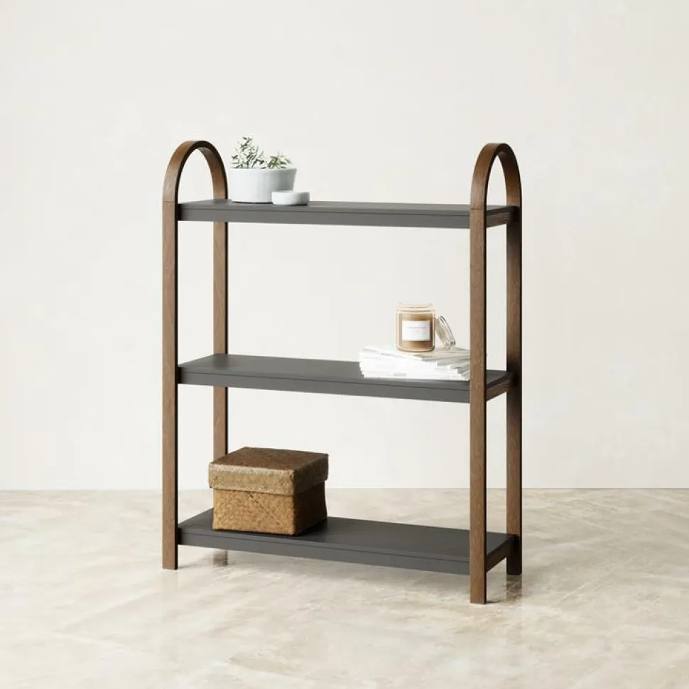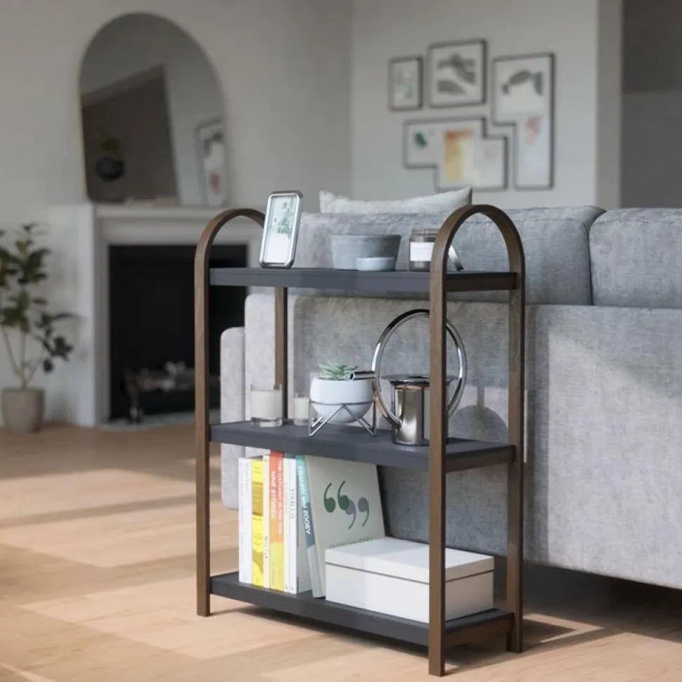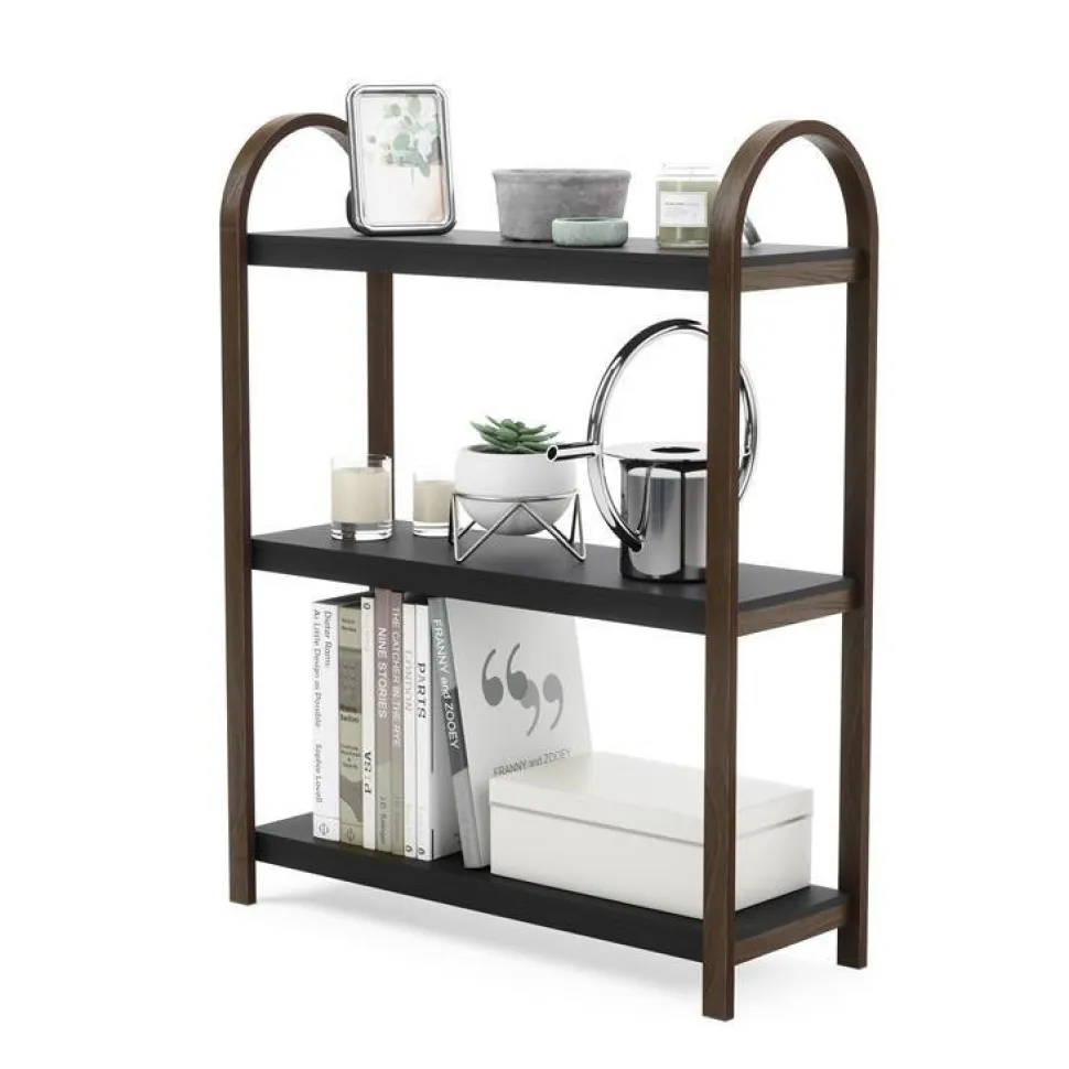 Regał Bellwoodposiada trzy szerokie półki z płyt MDF w okleinie oraz szkielet z drewna w kolorze ciemnego orzecha. MDF to wytrzymały materiał, który odporny jest na zniszczenia. Cechą charakterystyczną regału jest zaokrąglona górna część, która całej konstrukcji dodaje wizualnej lekkości. Oprócz świetnego aspektu wizualnego regał to także wiele miejsca do przechowywania. To doskonałe miejsce na ulubione książki, kwiatki czy innego rodzaju dekoracje. Bellwood dostępny także w kolorze białym z naturalnym wykończeniem. Zdecyduj, który lepiej wkomponuje się w twoje wnętrza!