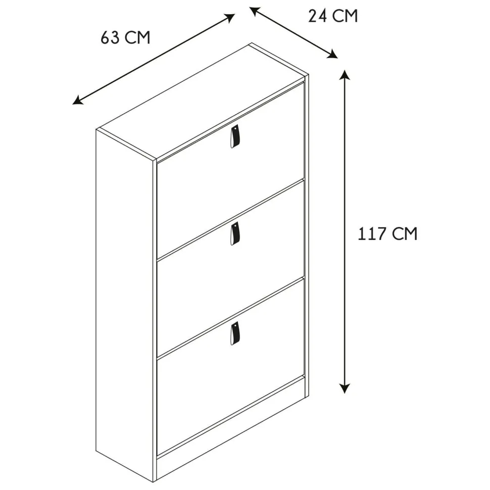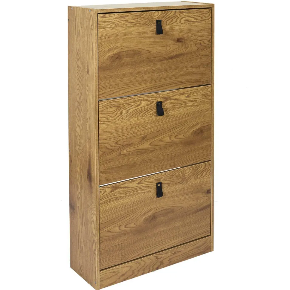 Wąska szafka na buty Abbott składa się z trzech frontów, które po uchyleniu umożliwiają nam schowanie butów w specjalnie przygotowanych na nie przegródkach.Szafkawyróżnia się minimalistyczną i prostą formą, która odnajdzie się w przedpokoju i korytarzu w każdym stylu. Cała konstrukcja oraz gładkie fronty wykonane zostały z laminowanej płyty MDF, która jest odporna na intensywne użytkowanie i posłuży w dobrym stanie przez wiele lat. Powierzchnia płyt pokryta została okleiną drewnianą w kolorze dębu. Szafka na buty Abbott to idealny mebel do jasnej kawalerki lub wnętrza w stylu skandynawskim. Szafka wymaga samodzielnego montażu.