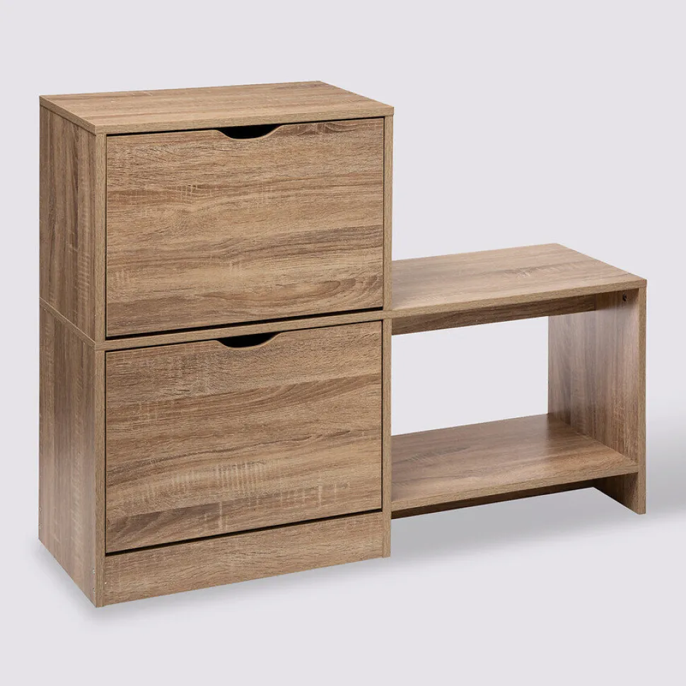 Szafka na buty Tiro z półką | 5five simply smart Minimalistyczna i elegancka szafka na buty Tiro od 5five simply smart to idealne rozwiązanie do przechowywania. Z dwoma szufladami oraz półką, aby pomieścić wiele par butów, wykonana została z płyty wiórowej. Nowoczesna szafka na buty Tiro to modny dodatek do każdego przedpokoju. Fachowo wykonana z elementów płyty wiórowej dla lekkiej i wytrzymałej konstrukcji, ma minimalistyczny design, który z pewnością przyciągnie uwagę Twoich gości. Dzięki dwóm szufladom otwieranym do przodu, z łatwością pomieści kilka par butów – idealna do każdego przedpokoju! Dodatkowo, wygodne wycięcia ułatwiają otwieranie szafek, gdy jesteś w ruchu. Nie szukaj dalej – elegancka szafka na buty Tiro to idealny element organizacyjny dla nowoczesnego domu. O tym warto pamiętać! Dodaj eleganckie rozwiązanie do przechowywania w swoim przedpokoju dzięki szafce na buty Tiro Uporządkowane i łatwe do znalezienia buty dzięki dwóm szufladom otwieranym do przodu W pełni skonstruowana z elementów płyty wiórowej dla trwałej wytrzymałości Łatwy dostęp i stylowy wygląd dzięki wygodnym wycięciom na frontach Oszczędność miejsca w przedpokoju bez poświęcania stylu