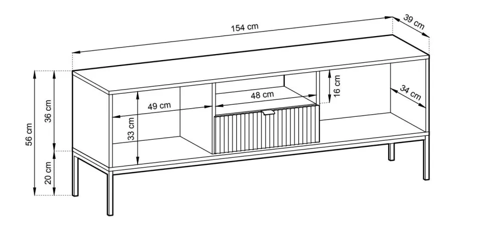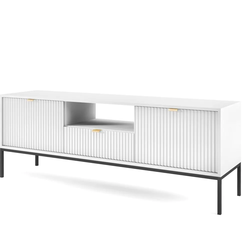Szafka RTV Delicious z ryflowanymi frontami ozdobi nasze wnętrze w nowoczesnym stylu i doda mu swoistego uroku. Ryflowane front szuflady i szafek podkreślaja stylowy, aluminiowy uchwyt w kolorze złotym. Szafka o szerokości 154 cm i głębokości 39 cm pozwoli na uporządkowanie nie tylko dekoderów oraz odtwarzaczy, ale również innych przedmiotów jak ładowarki telefonów czy konsole do gier. Podstawą stolika są metalowe, stabilne nogi. Szafka na wysokich nogach jest wygodnym meblem, gdyż łatwo jest pod nią odkurzyć oraz wytrzeć podłogę. Cienkie eleganckie nogi dodają jej również wizualnej lekkości, która jest bardzo ważna w niedużych pomieszczeniach.Wymiary opakowania: 151x25x3,5cm i 161x44x9,5cm, Waga: 2,8 i 29kg