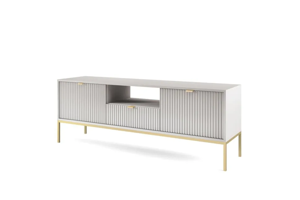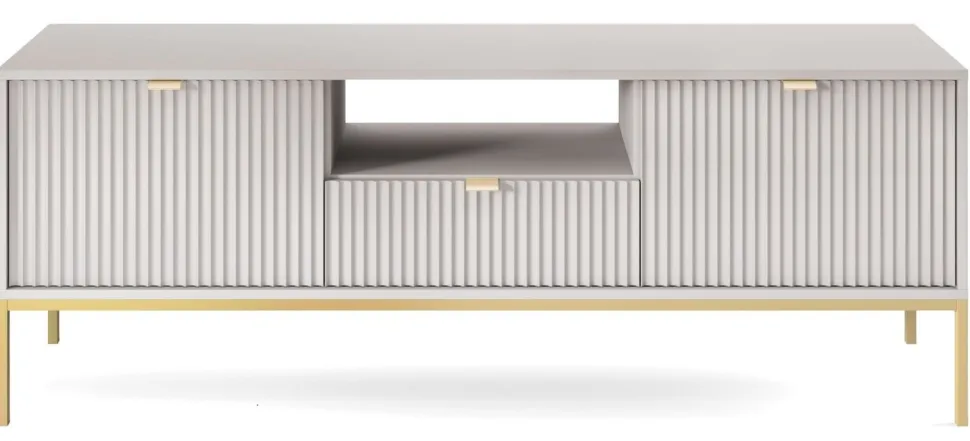 Uzyskaj nowoczesny i stylowy wygląd dzięki ryflowanej szafce Delicious od Intesi. Szafka ma ryflowane fronty szuflad i szafek podkreślone aluminiowym uchwytem w kolorze złotym. Szafka ma 154 cm szerokości i 39 cm głębokości, dzięki czemu idealnie nadaje się do przechowywania dekoderów, ładowarek, konsol do gier i nie tylko!