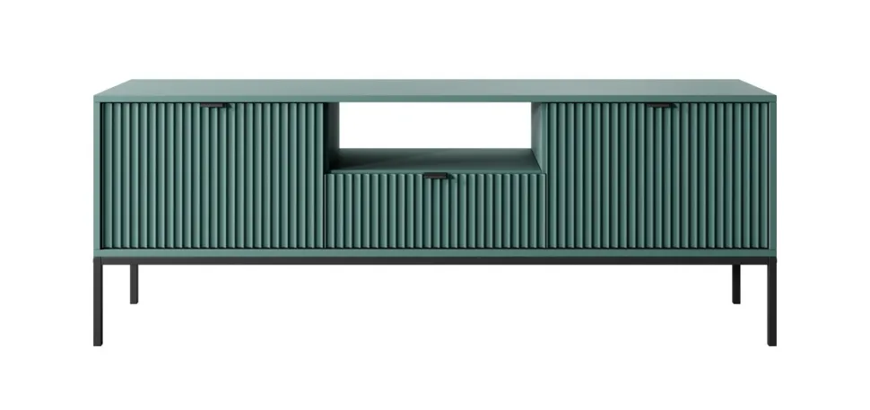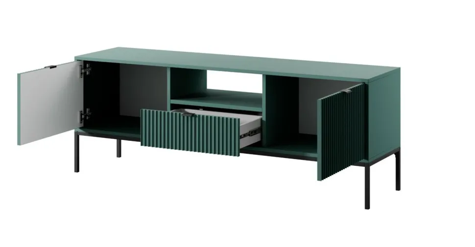 Zaprojektowana z myślą o miłośnikach nowoczesnej estetyki, Szafka RTV Delicious ryflowana zielona z czarnymi uchwytami, stanowi połączenie wyrafinowanej elegancji i praktycznej funkcjonalności. Jej charakterystycznym elementem są ryflowane fronty, które w połączeniu z aluminiowymi uchwytami w kolorze złotym tworzą niepowtarzalny, stylowy design. Szafka ma szerokość 154 cm i głębokość 39 cm, co umożliwia przechowywanie nie tylko sprzętu RTV, ale także innych przedmiotów, takich jak ładowarki czy konsole do gier. Dzięki wysokim, metalowym nogom, pod meblem łatwo można odkurzyć i utrzymać czystość.