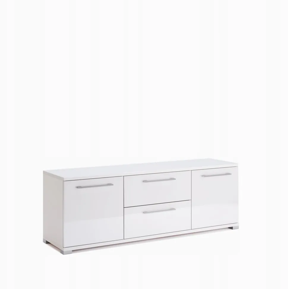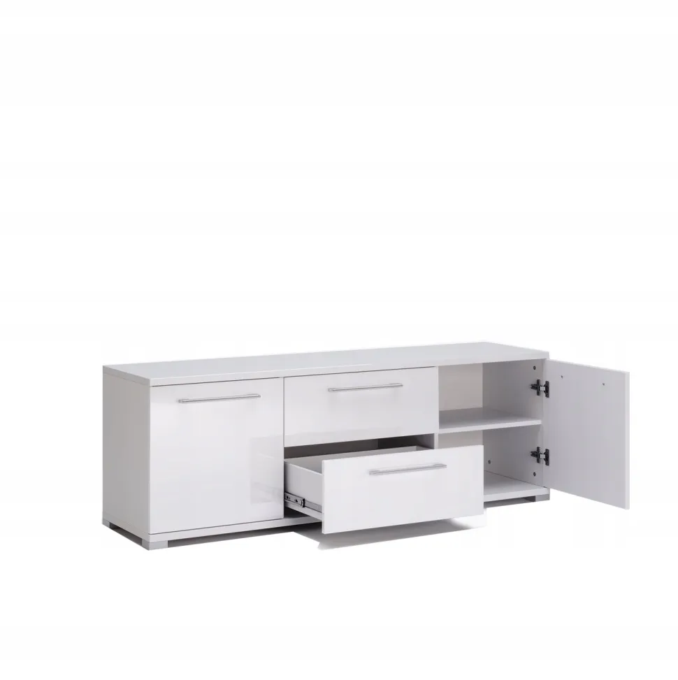 Blaty oraz fronty wykonane są z wysokiej jakości płyty wiórowej, pokrytej trzywarstwową powłoką lakierniczą i suszoną promieniami UV. Dzięki temu uzyskano doskonałą błyszczącą, nieżółknącą z czasem powierzchnię, która zatrzymuje swój atrakcyjny wygląd przez wiele lat. Zawiasy zostały wzmocnione zatrzaskowym domykiem. Prowadnice teleskopowe z wysuwem i cichym domykiem, dodatkowo zwiększają komfort użytkowania. Styl skandynawski, charakteryzujący się prostotą formy, określonymi materiałami i jasnymi kolorami, doskonale komponuje się z eleganckim designem szafki RTV. Jest to rozwiązanie alternatywne, jak i klasyczne aranżacje wnętrz, dające im zastosowanie i charakter.