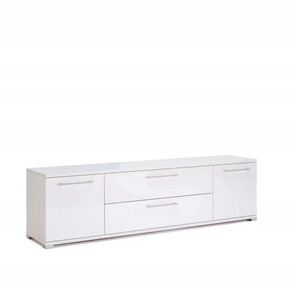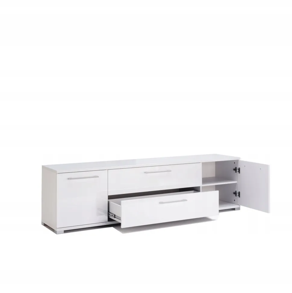 Blaty oraz fronty wykonane są z wysokiej jakości płyty wiórowej, pokrytej trzywarstwową powłoką lakierniczą i suszoną promieniami UV. Dzięki temu uzyskano doskonałą błyszczącą, nieżółknącą z czasem powierzchnię, która zatrzymuje swój atrakcyjny wygląd przez wiele lat. Zawiasy zostały wzmocnione zatrzaskowym domykiem. Prowadnice teleskopowe z wysuwem i cichym domykiem, dodatkowo zwiększają komfort użytkowania. Styl skandynawski, charakteryzujący się prostotą formy, określonymi materiałami i jasnymi kolorami, doskonale komponuje się z eleganckim designem szafki RTV. Jest to rozwiązanie alternatywne, jak i klasyczne aranżacje wnętrz, dające im zastosowanie i charakter.