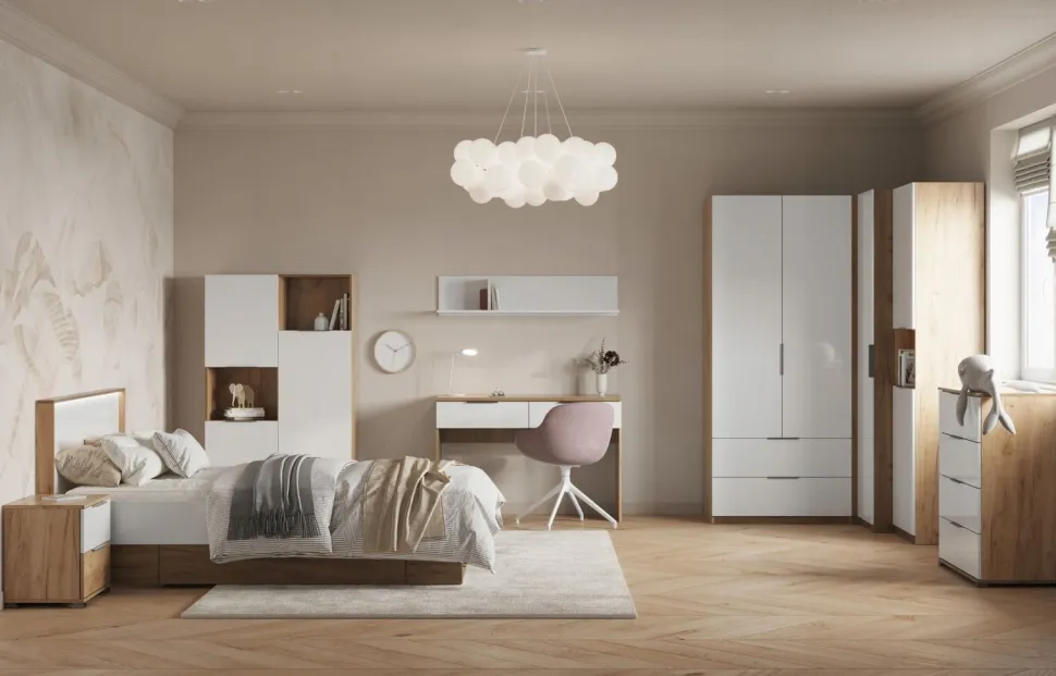Poszukując mebli do swojej sypialni, warto zwrócić uwagę na szafkę Tissa. To połączenie funkcjonalności z estetyką, które idealnie wpisuje się w dzisiejsze trendy wnętrzarskie. Kontrastująca kolorystyka Biały Połysk i Dąb Craft nie tylko prezentuje się stylowo, ale także nadaje pomieszczeniu wyjątkowego charakteru.