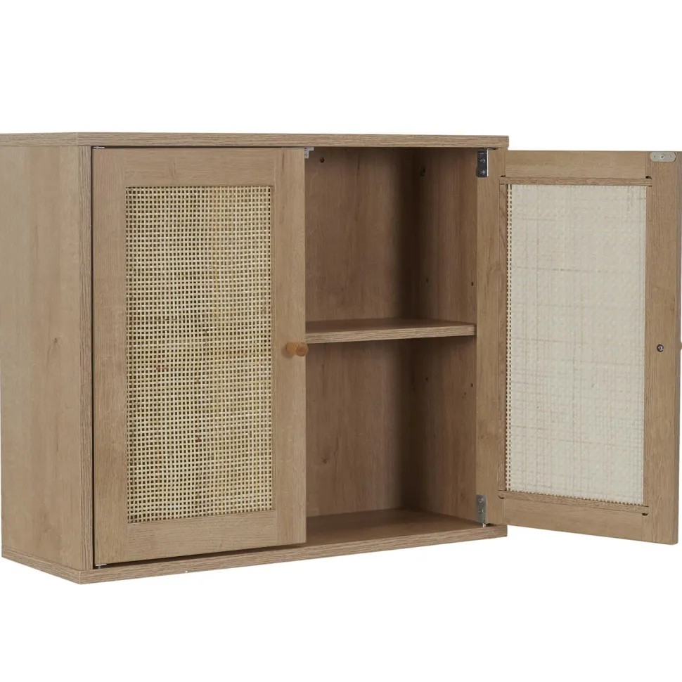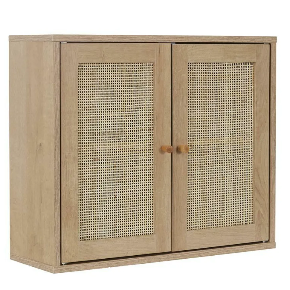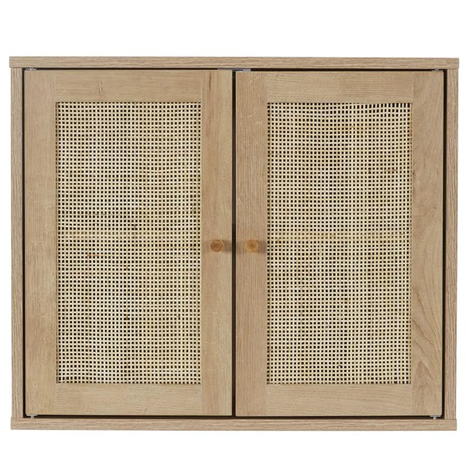 Szafka wisząca Bali to doskonałe rozwiązanie dla tych, którzy cenią sobie zarówno estetykę, jak i funkcjonalność w swojej łazience. Wykonana z wysokiej jakości płyty MDF pokrytej imitacją dębu, ta szafka dodaje naturalnego i orientalnego uroku każdej łazience. Fronty szafki ozdobione rattanowymi wstawkami nadają meblowi niepowtarzalnego charakteru.Dwie szerokie półki gwarantują mnóstwo miejsca do przechowywania kosmetyków oraz innych niezbędnych akcesoriów łazienkowych, co sprawia, że utrzymanie porządku w łazience staje się prostsze niż kiedykolwiek wcześniej.