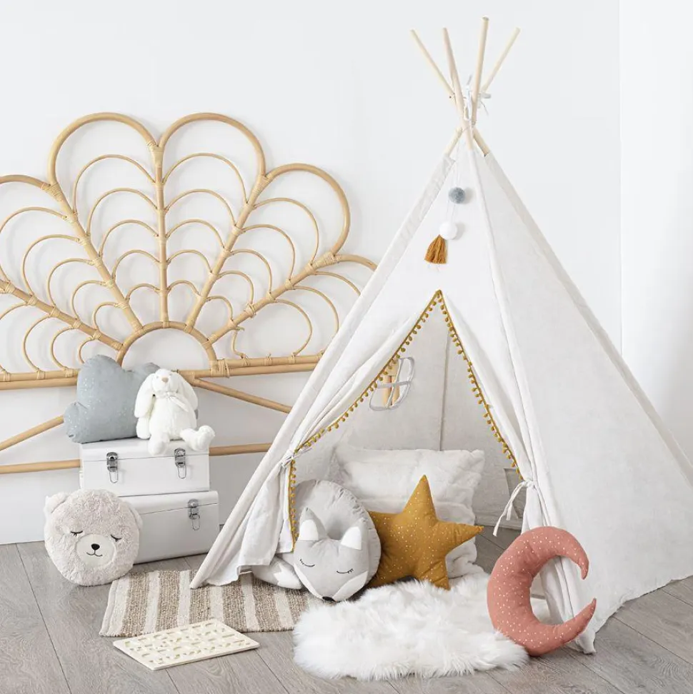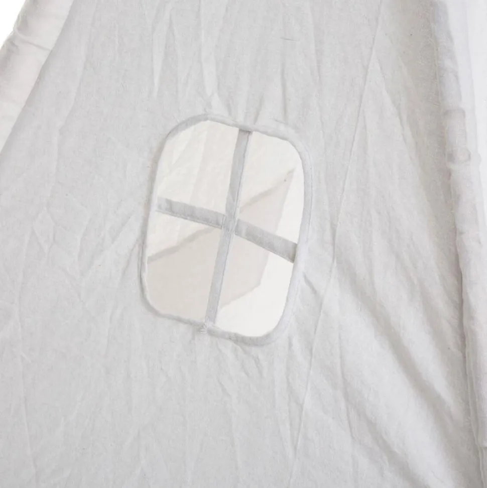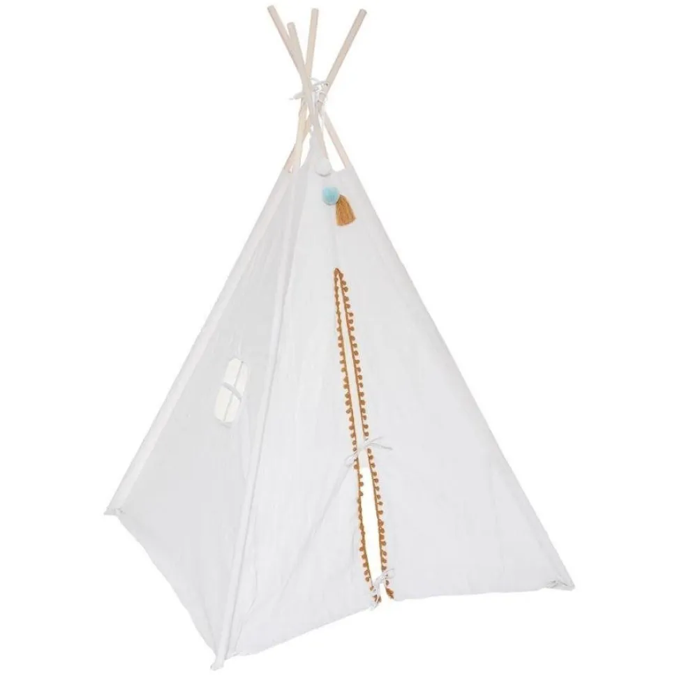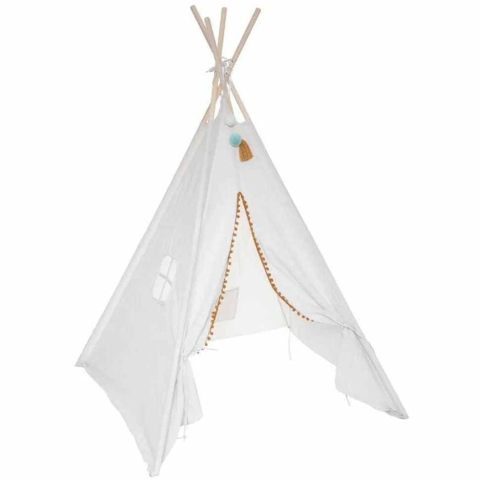 Ten piękny kremowy namiot dziecięcy Tipi od Tend jest idealny do użytku wewnętrznego lub zewnętrznego. Wykonany z mieszanki bawełny i poliestru, jest lekki i łatwy w montażu, z ramą wykonaną z drewna topoli. Posiada również boczne okno i miękkie dekoracje z pomponów.