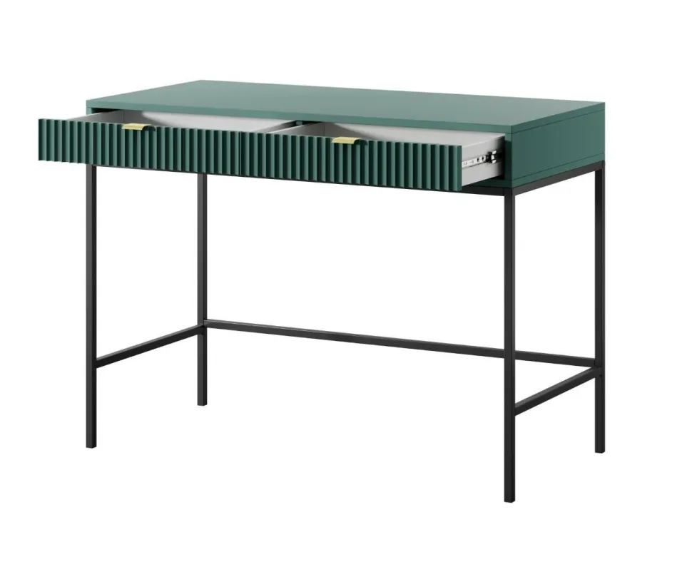Delicious to toaletka, która łączy w sobie nowoczesny design z praktycznymi rozwiązaniami. Jej zielony kolor z ryflowanymi frontami szuflad oraz złotymi uchwytami z aluminium dodają wnętrzu niepowtarzalnego uroku. Ponadto, dzięki swoim wymiarom (szerokość 104 cm, głębokość 50 cm) pozwala na uporządkowanie wielu przedmiotów, od kluczy, poprzez ładowarki telefonów, aż po kosmetyki. Toaletka posiada wysokie, metalowe nogi, które umożliwiają łatwe sprzątanie pod meblem. Cienkie, eleganckie nogi dodają toaletce wizualnej lekkości, co jest szczególnie ważne w małych pomieszczeniach.
