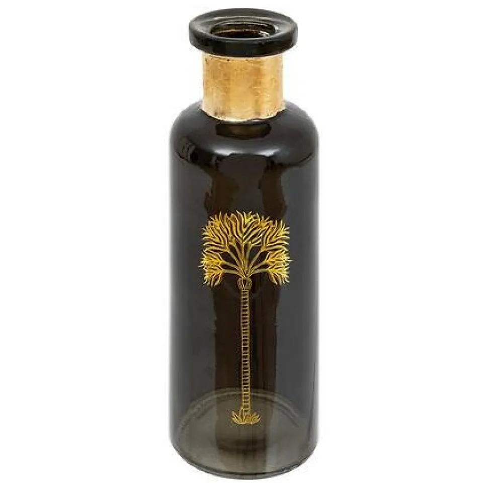 Wazon Tropical Boudoir od Atmosphera to wyjątkowy element dekoracyjny, który doda uroku każdemu pomieszczeniu. Wykonany z szkła w kolorze khaki, ma kształt butelki o wysokości 22 cm, co nadaje mu niepowtarzalnego charakteru. Jego szyjka jest ozdobiona złotym nadrukiem, a bok – złotym wzorem z imitacją liści. Te detale, w połączeniu z motywem palmy, dodają mu egzotycznego uroku.