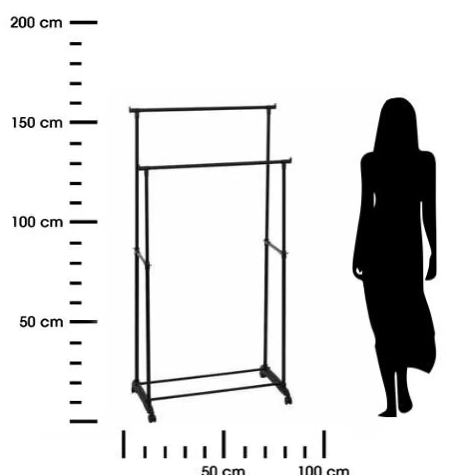 Wieszak na ubrania podwójny czarny to idealne rozwiązanie dla osób, które potrzebują dodatkowej przestrzeni na przechowywanie odzieży. Jego wymiary wynoszą 80 cm szerokości, 43 cm głębokości oraz 160 cm wysokości, co pozwala na wygodne umieszczenie wieszaka w różnych pomieszczeniach. Dzięki rozsuwanej szerokości (110 cm, 135 cm, 160 cm), wieszak można dostosować do ilości ubrań, które chcemy na nim zawiesić, co czyni go bardzo praktycznym i elastycznym w użyciu.