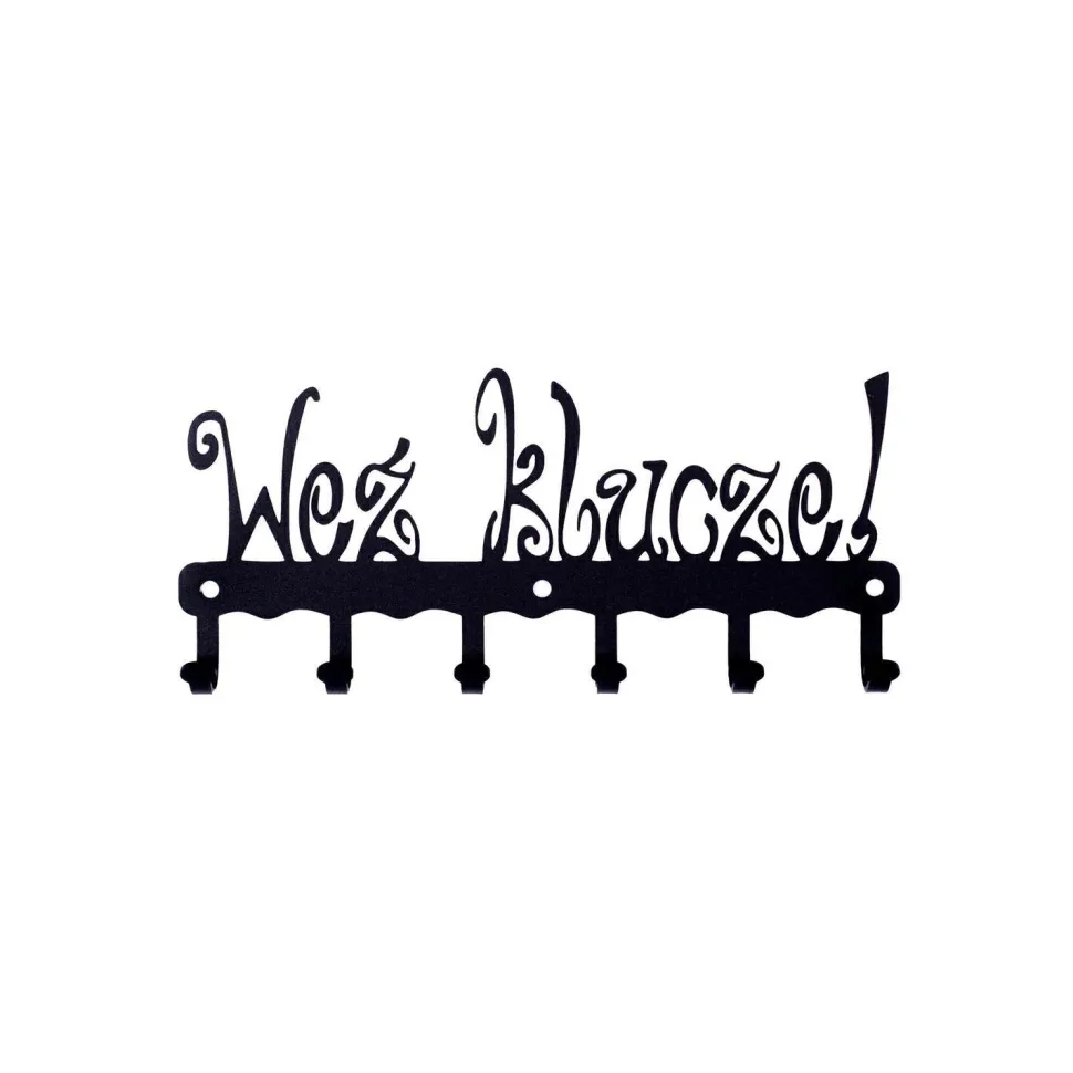 Wieszak ścienny Weź klucze to stylowe rozwiązanie do przedpokoju, holu lub recepcji. Wzór, z napisem przypominającym o zabraniu ze sobą kluczy, nada uroku każdemu wnętrzu. Stalowy malowany proszkowo wieszak jest praktyczny oraz odporny na uszkodzenia. Matowe wykończenie dodaje listwie klasy. Dzięki 6 haczykom o udźwigu do 3kg każdy, możemy powiesić na wieszaku klucze, kurtki lub nawet torby. Produkt dostępny jest w dwóch kolorach co zwiększa jego możliwości aranżacyjne. Maksymalne obciążenie to 18kg. Do wieszaka załączany jest zestaw montażowy, który składa się z kołków, zaślepek i śrubek.
