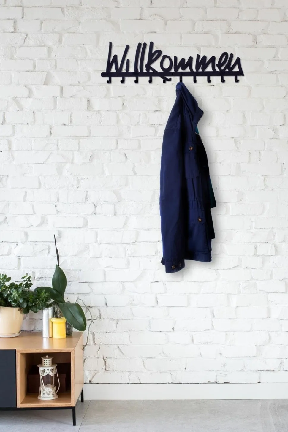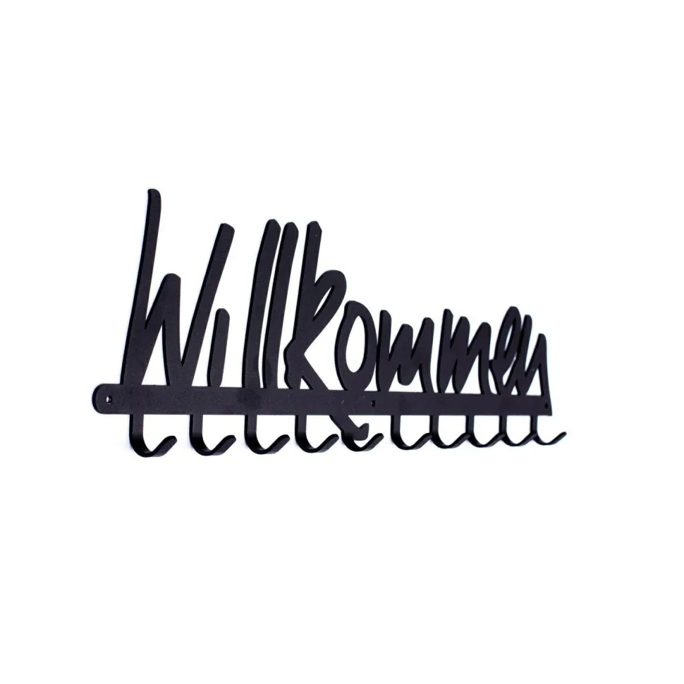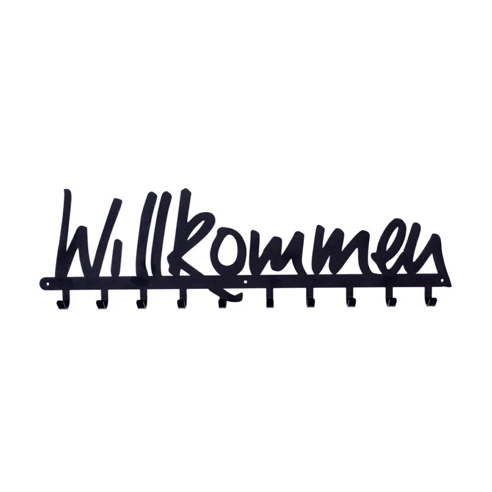 Wieszak ścienny Willkommen to nowoczesne rozwiązanie do przedpokoju, holu lub poczekalni. Jego precyzyjnie wycięty laserowo wzór, z napisem witającym gości, nada uroku każdemu wnętrzu. Stalowy malowany proszkowo wieszak jest uniwersalny oraz odporny na uszkodzenia. Matowe wykończenie dodaje listwie stylu. Dzięki aż 9 haczykom o udźwigu do 3kg każdy, możemy powiesić na wieszaku klucze, kurtki lub nawet torby. Produkt dostępny jest w dwóch kolorach co zwiększa jego możliwości aranżacyjne. Maksymalne obciążenie to 27kg. Do wieszaka załączany jest zestaw montażowy, który składa się z kołków, zaślepek i śrubek.