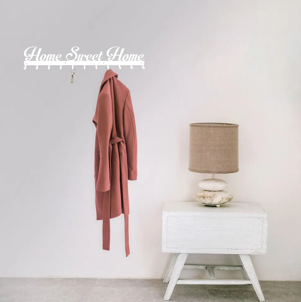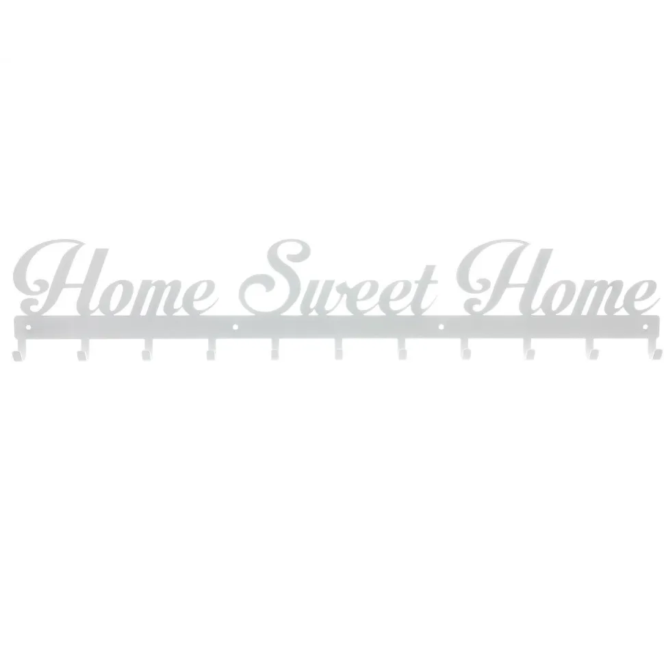 Wieszak Sweet Home wykonany został z wytrzymałego metalu malowanego proszkowo. Wieszak posiada 11 haczyków, które pomogą utrzymać porządek na korytarzu, holu czy restauracyjnej recepcji. Utrzymany w nowoczesnym tonie wieszak wtopi się we wnętrze dodając mu wyjątkowo przytulnego charakteru.Do wieszaka załączony jest zestaw montażowy, składający się z 4 kołków, 4 śrubek i 4 zaślepek