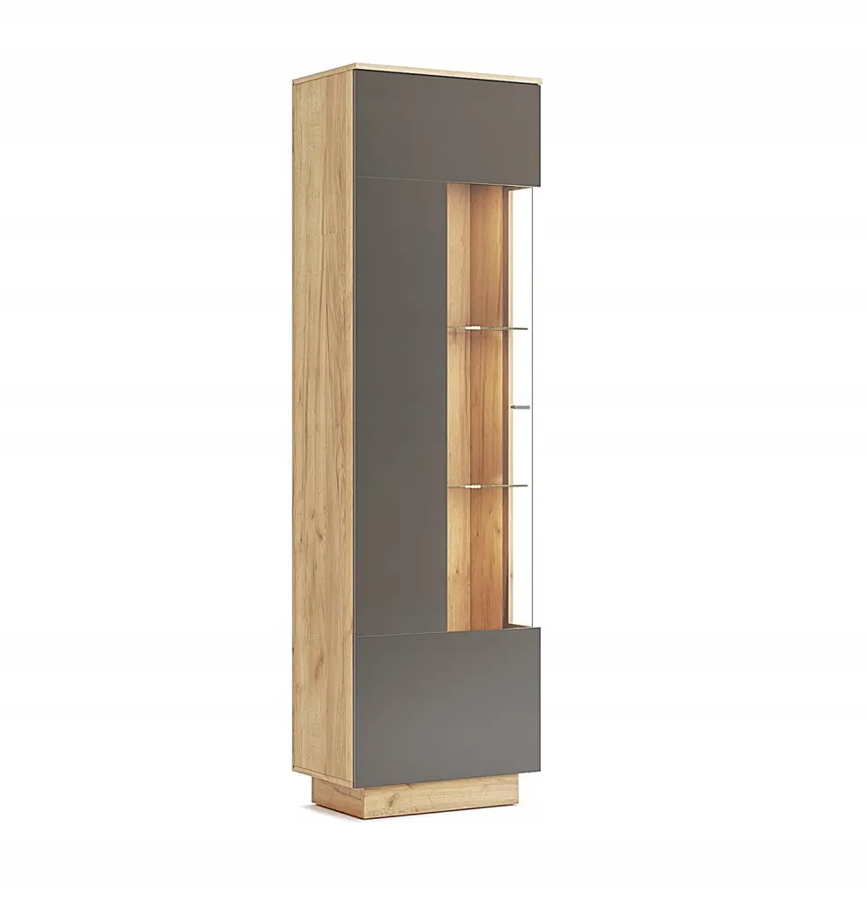Witryna Lana prawa LED dąb/szary to mebel o nowoczesnym stylu, charakteryzujący się minimalistyczną estetyką, idealny dla osób poszukujących niepowtarzalnego designu i śledzących najnowsze trendy w aranżacji wnętrz. Kontrastowe połączenie barw dębu i szarości tworzy harmonijny duet, podkreślając elegancję mebla. Szklane półki oraz drzwi dodają witrynie lekkości i finezji.