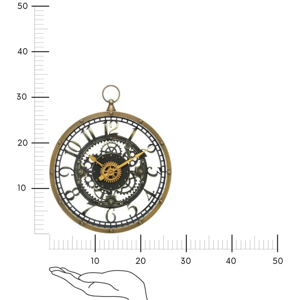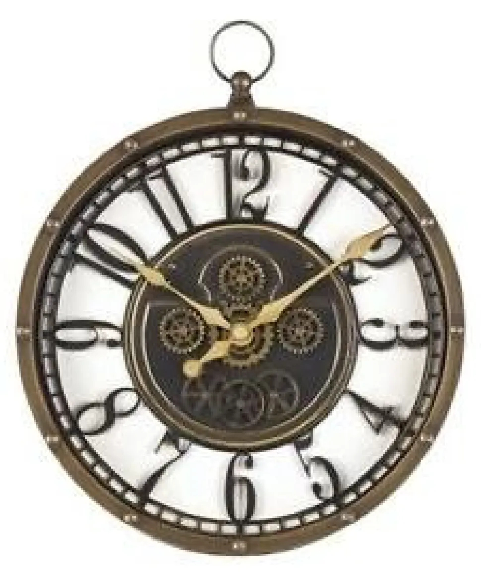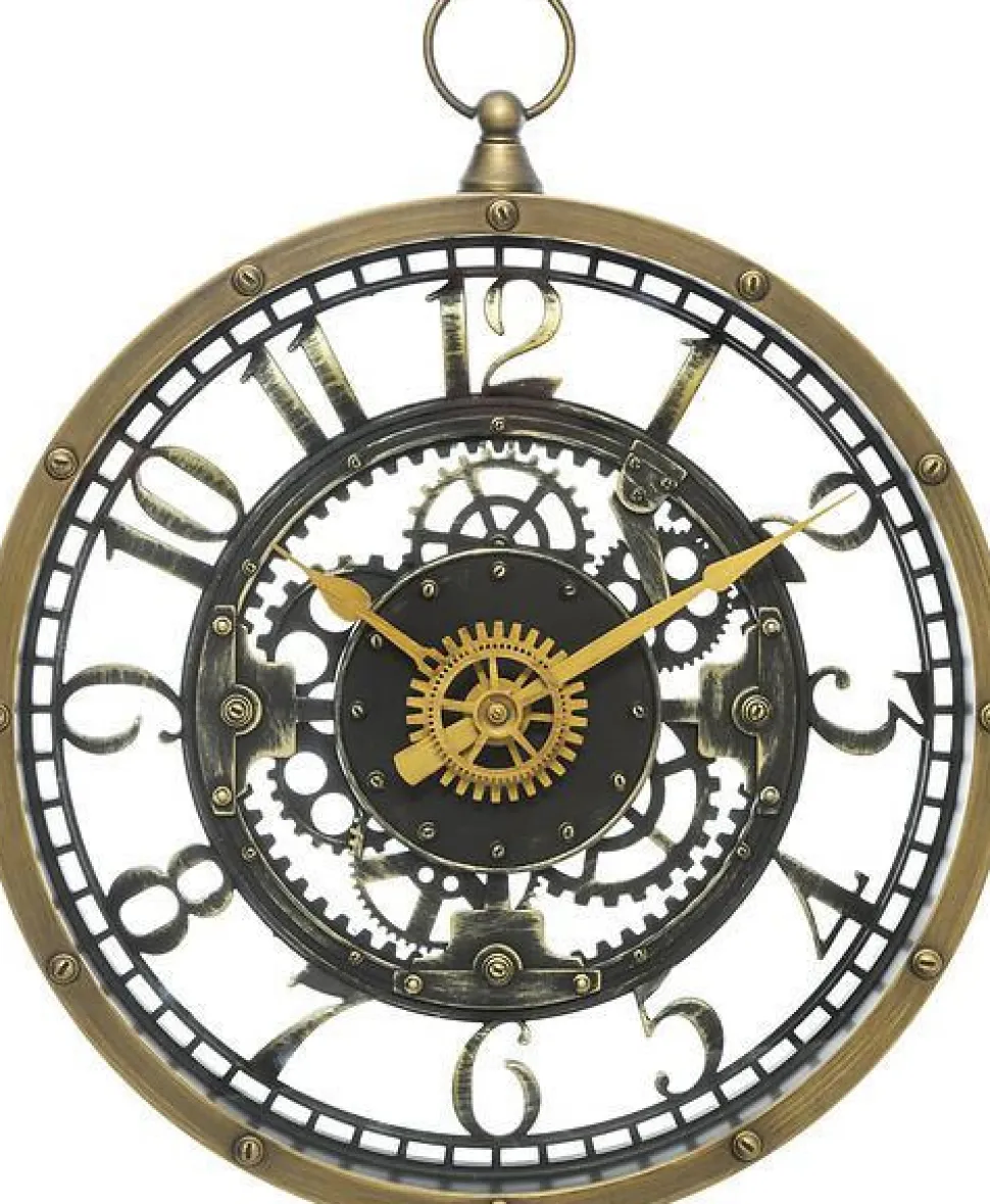 Zegar Meca w stylu industrialnym w kolorze postarzanego złota z ażurową tarczą przypominającą pracujące tryby to świetny dodatek do każdego pomieszczenia.