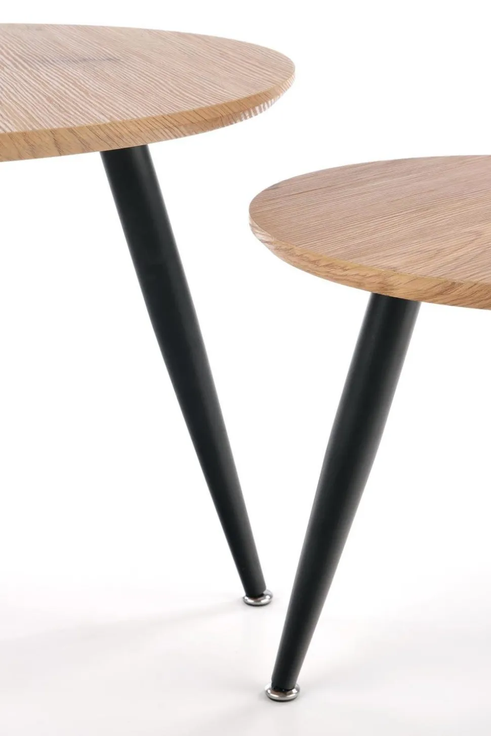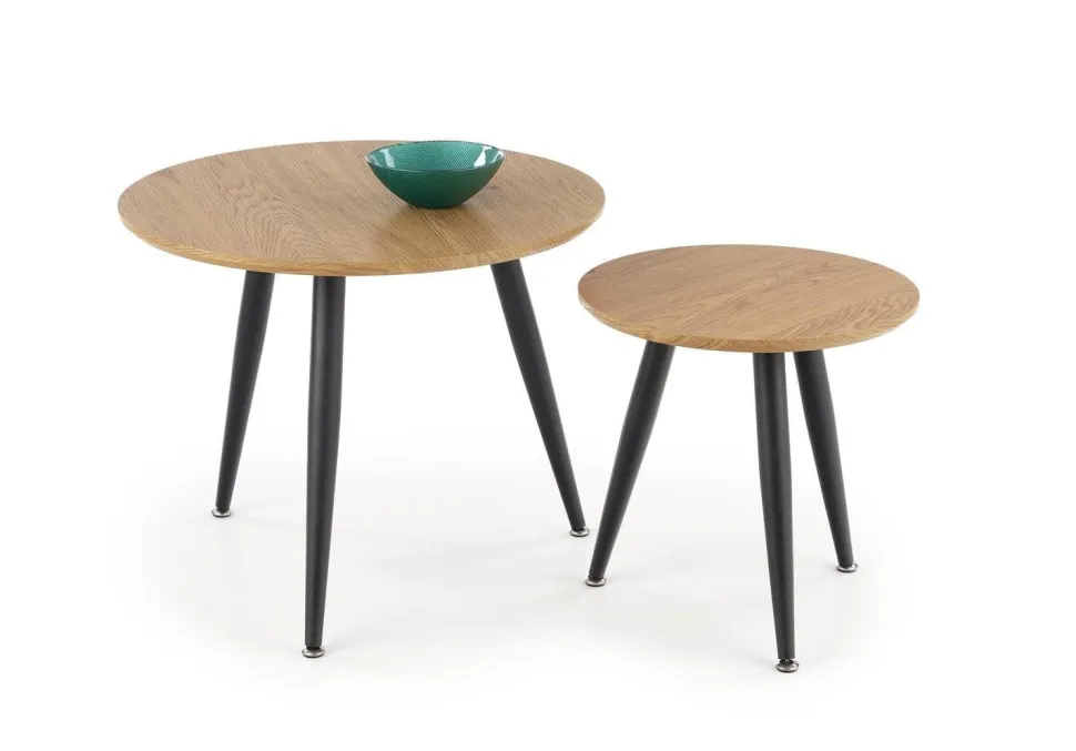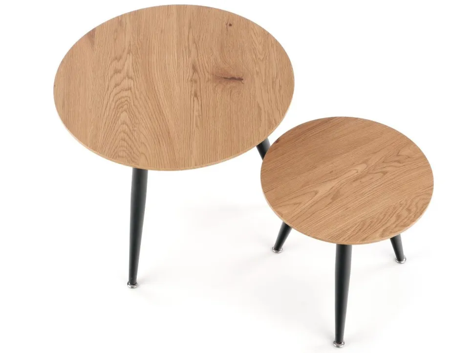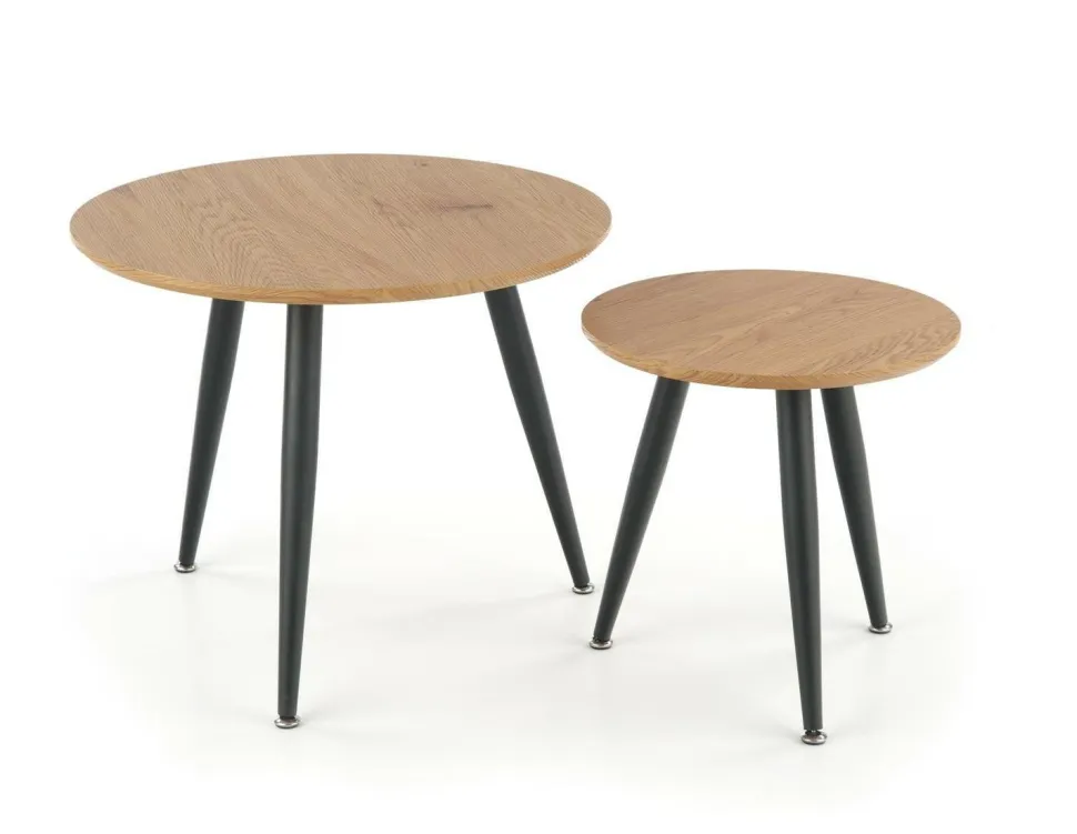 Kolorystyka tych stolików to dąb złoty i czarny, co idealnie wpisuje się w trendy loftowego i skandynawskiego stylu. Dzięki temu, zestaw ten będzie doskonale komponować się z innymi elementami Twojego wnętrza, dodając mu niepowtarzalnego charakteru.Stelaż tych stolików został wykonany z metalu, co zapewnia im stabilność i solidność. Dodatkowo, stal malowana proszkowo gwarantuje odporność na uszkodzenia i zarysowania. Możesz być pewien, że te stoliki będą służyć Ci przez wiele lat, nie tracąc swojego uroku. Blat tych stolików ma kształt okrągły, co sprawia, że są one nie tylko praktyczne, ale także estetyczne. Blat wykonany jest z MDF okleinowanego, co daje efekt naturalnego drewna.