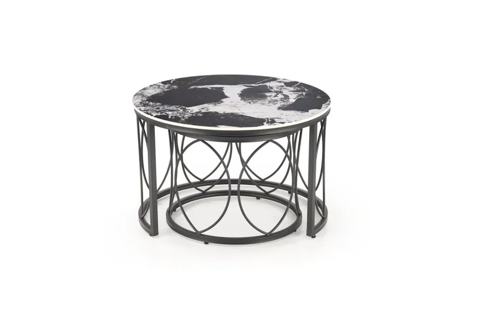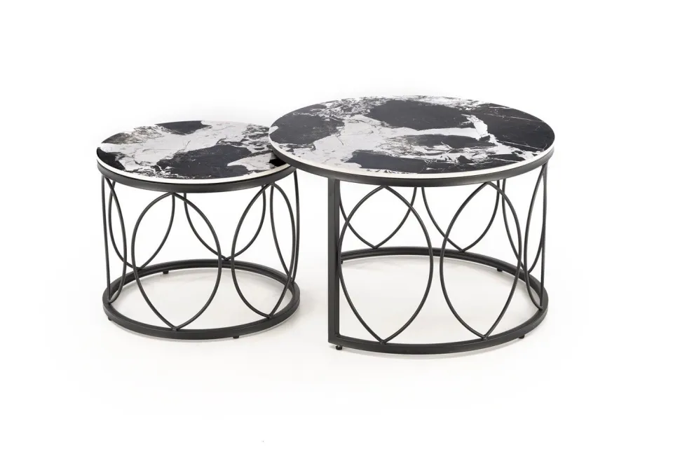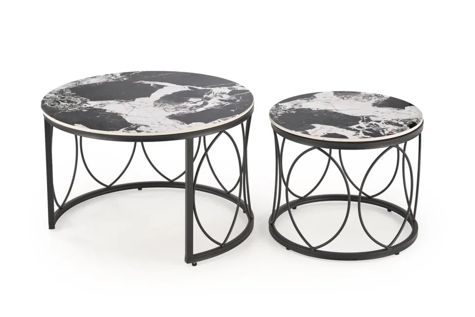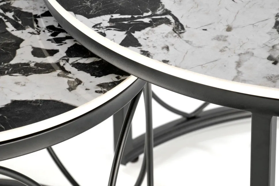 Stoliki Dariam wyróżniają się nowoczesnym i eleganckim designem, który doskonale wkomponuje się w różnorodne aranżacje wnętrz. Blaty wykonane ze spieku o wykończeniu imitującym czarny marmur nadają im luksusowy wygląd, jednocześnie zapewniając trwałość i odporność na uszkodzenia. Stal malowana proszkowo, użyta do wykonania podstawy, zapewnia stabilność oraz dodatkowo podkreśla nowoczesny charakter mebli.