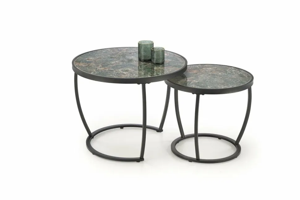 Zestaw 2 stolików kawowych Sonja w kolorach zielonego marmuru i czerni to kwintesencja nowoczesnego stylu i elegancji. Wykonane z materiałów najwyższej jakości, stoliki te wyróżniają się solidnością i wytrzymałością. Blaty imitujące zielony marmur nadają im luksusowy wygląd, który doskonale komponuje się z różnymi aranżacjami wnętrz. Stalowe nogi malowane proszkowo na czarno zapewniają nowoczesny akcent i stabilność, idealnie współgrając z marmurowymi blatami. Zestaw zawiera dwa stoliki o różnych rozmiarach: większy o wymiarach 62 cm średnicy i 50 cm wysokości oraz mniejszy o średnicy 47 cm i wysokości 43 cm, co pozwala na elastyczne i praktyczne rozmieszczenie w salonie.