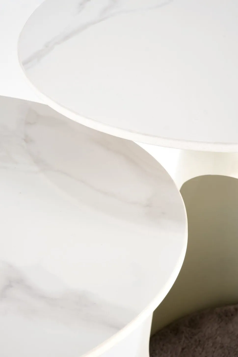 Te stoliki to idealne połączenie stylu glamour z nowoczesnym designem. Biały marmur, z którego wykonany jest blat, doda klasy każdemu pomieszczeniu. Natomiast stalowa podstawa w kolorze białym, podkreśla nowoczesny charakter mebla. Stoliki Mae będą doskonałym wyborem do salonu, biura, pokoju młodzieżowego czy sypialni.