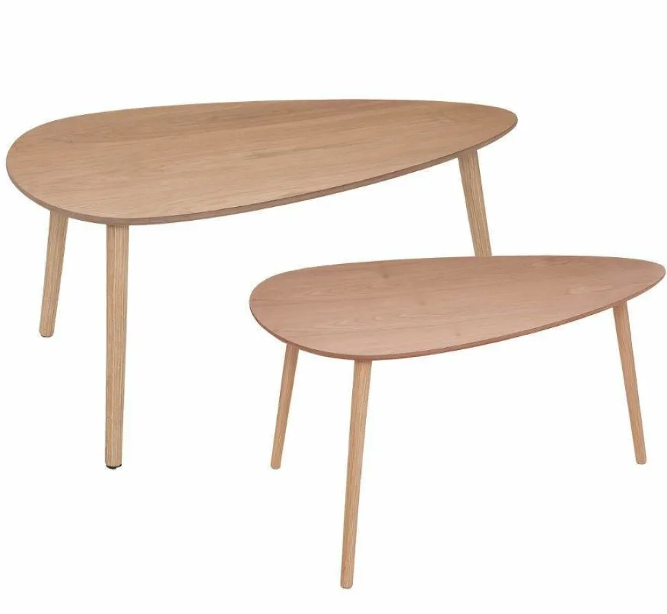 Zestaw dwóch stolików w kolorze naturalnym sprawdzi się w salonie obok sofy. Stoliki o dwóch rozmiarachmożna ustawić razem lub używać całkiem osobno. Trwałapłyta meblowa w naturalnej okleinie, jest bezpieczna i odporna na zarysowania. Podstawą stolików są nogi z drewna sosnowego.