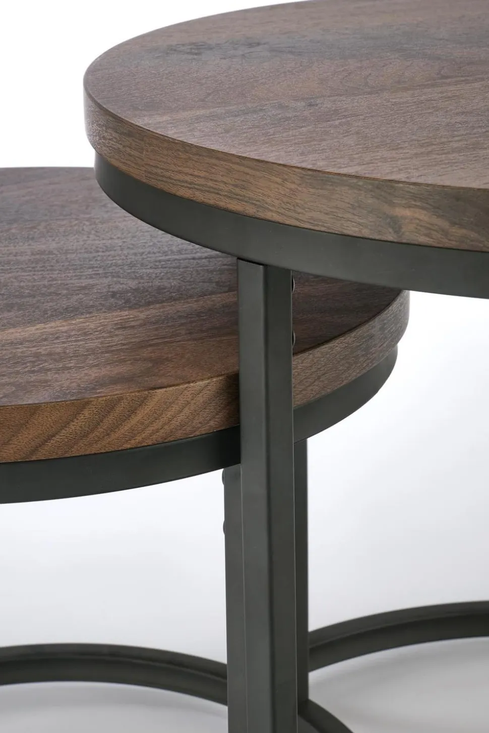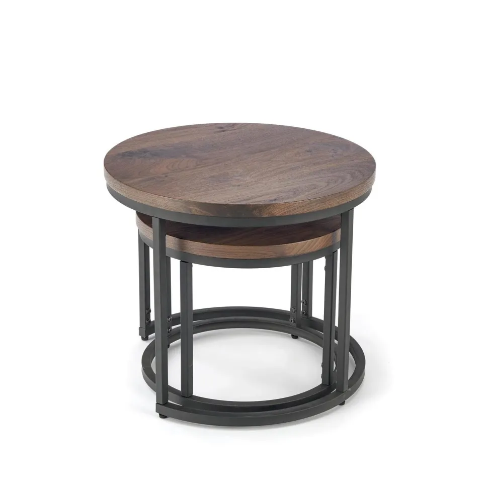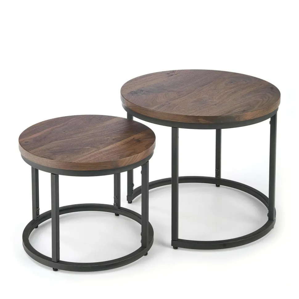 Stwórz idealne warunki do rozrywki w domu dzięki temu nowoczesnemu zestawowi 2 stolików Tabarka w stylu loftowym.Malowane proszkowo stalowe ramyinaturalneorzechoweblaty z fornirowanej płyty MDFdodadzą śmiałości Twojej przestrzeni życiowej.