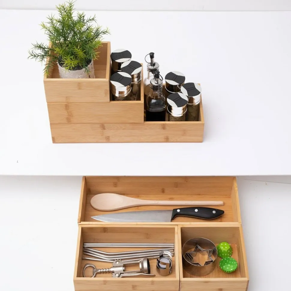 Organizerywykonane są w całości z bambusa, dlatego posłużą przez długi czas. W skład zestawu wchodzą trzy pojemniki o różnych wielkościach. Największy: 38×14,9x7cm, Średni: 23×14,9x7cm, Mały: 15×14,9x7cm. Idealnie uzupełnią szufladę w kuchni, zaprowadzając w niej porządek lub w łazience jako pojemniki na kosmetyki. Ułożenie w szufladzie organizerów o różnych kształtach pozwoli na organizację sztućców lub przypraw w dowolny dla nas sposób.Nie czekaj dłużej i spraw bliskim idealny prezent, jakim jest nasz zestaw bambusowych organizerów od5five simply smart!