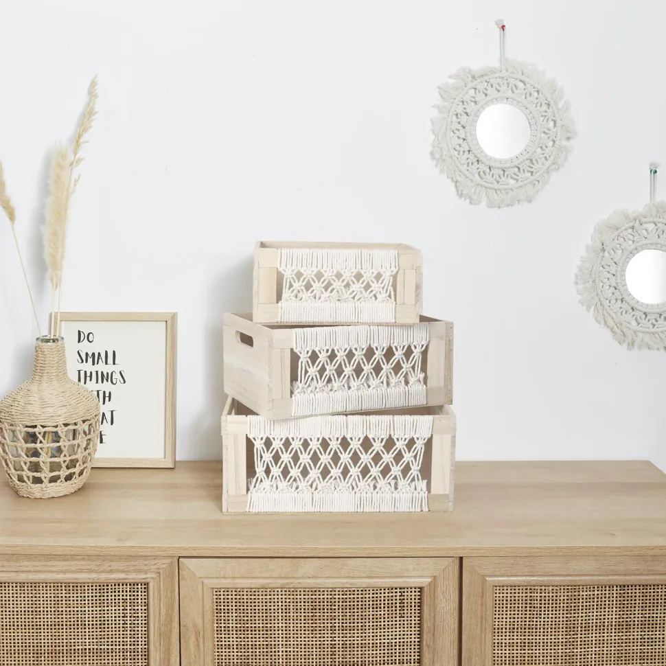 Styl boho wprowadza do wnętrza ciepło i przytulność. Drewniane elementy w połączeniu z naturalnym sznurkiem tworzą harmonijną całość, która pasuje do wielu różnych stylów aranżacji wnętrz. Pudełka Gigogne to nie tylko praktyczny sposób na organizację przestrzeni, ale także estetyczny dodatek, który podkreśli charakter Twojego domu.