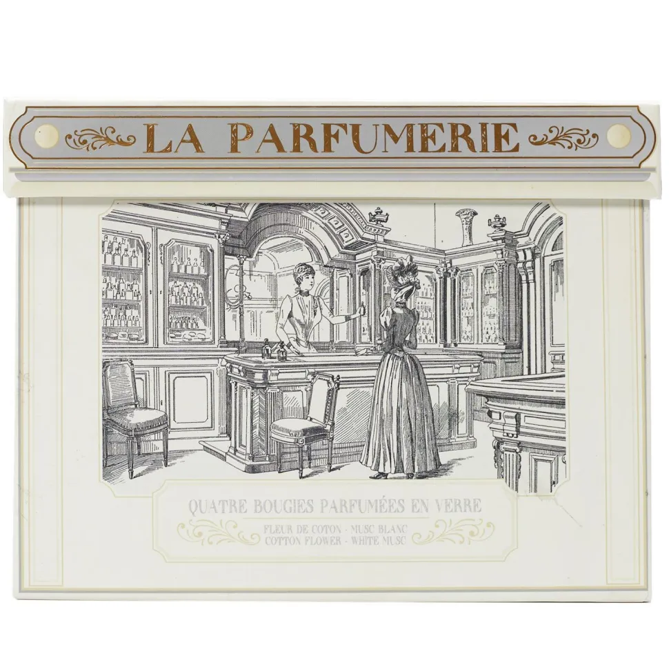 Zestaw czterech świeczek zapachowych La Parfume to ciekawy prezent dla osób ceniących francuskie zapachy. Produkty zapakowane zostały w ozdobne pudełko. Świeczki występują w dwóch różnych zapachach: białe piżmo oraz kwiat bawełny. Są to świeże zapachy o lekkich i zwiewnych nutach. Idealne na każdą porę roku. Wymiary pojedynczej świeczki: wysokość 4,1cm oraz średnica 6,7cm