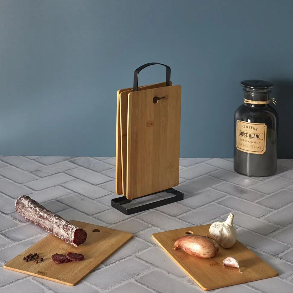 - Zestaw składa się z 6 bambusowych desek do krojenia umieszczonych na metalowym stojaku.