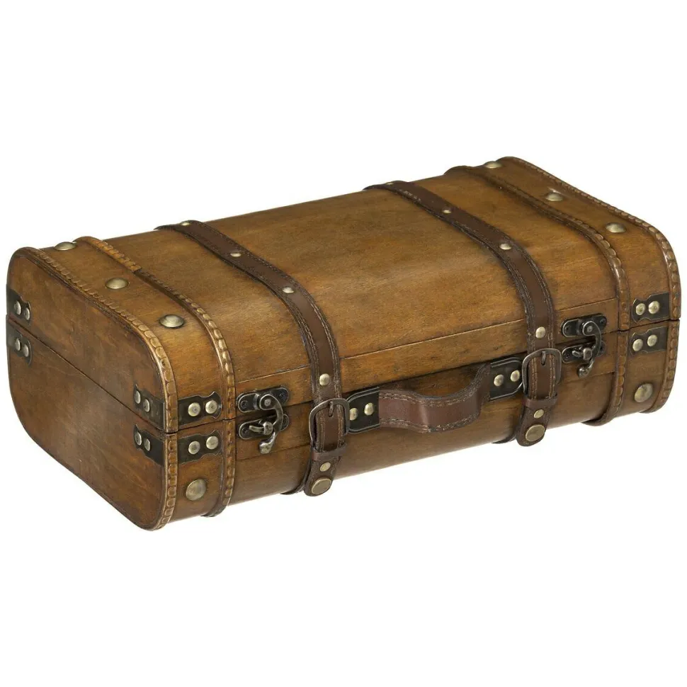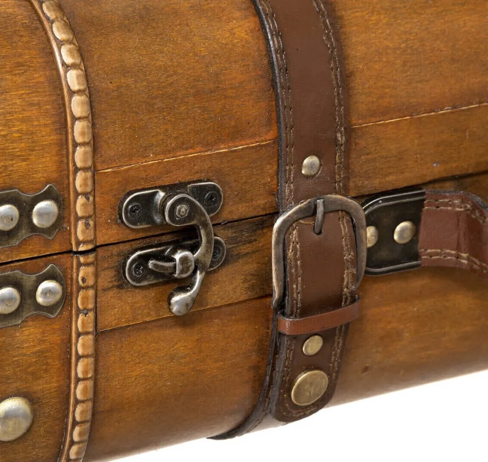 - Pudełka są wykonane ze sklejki i ozdobione metalowymi i skóropodobnymi elementami, co nadaje im wyjątkowego, postarzanego charakteru