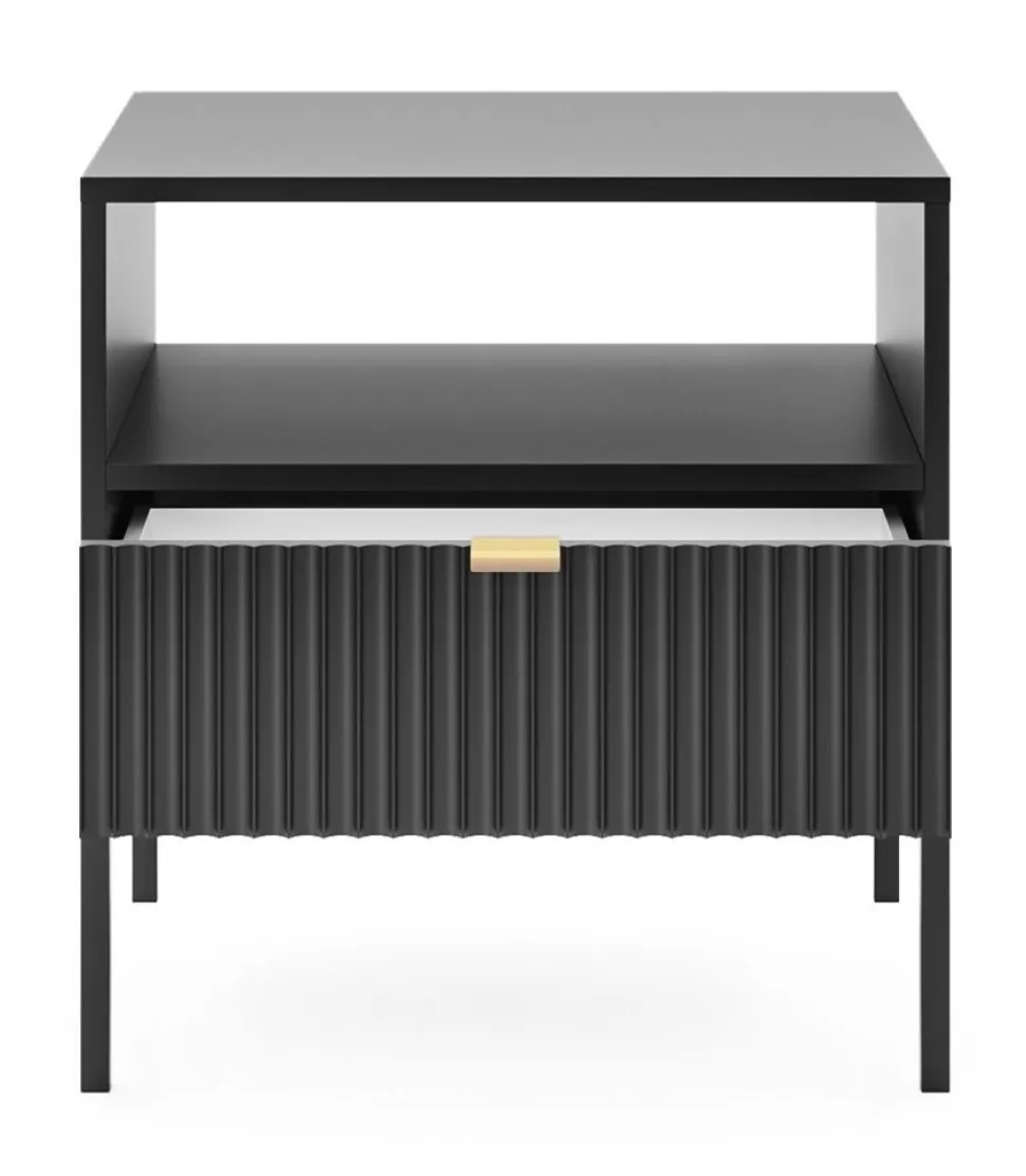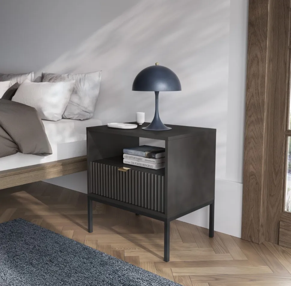 Elementem zestawu do sypialni Delicious jest między innymiszafka nocna. Ryflowany front nadaje szafce nocnej niezwykłego uroku, tworząc jednocześnie subtelną strukturę, która przyciąga uwagę w każdej sypialni. Szafka nocna oferuje odpowiednią ilość miejsca do przechowywania przedmiotów, które chcesz mieć zawsze pod ręką, a także miejsce do ustawienia lampki nocnej. Dzięki temu będzie niezastąpionym meblem, który pokochasz nie tylko ze względu na piękny wygląd, ale i funkcjonalność.