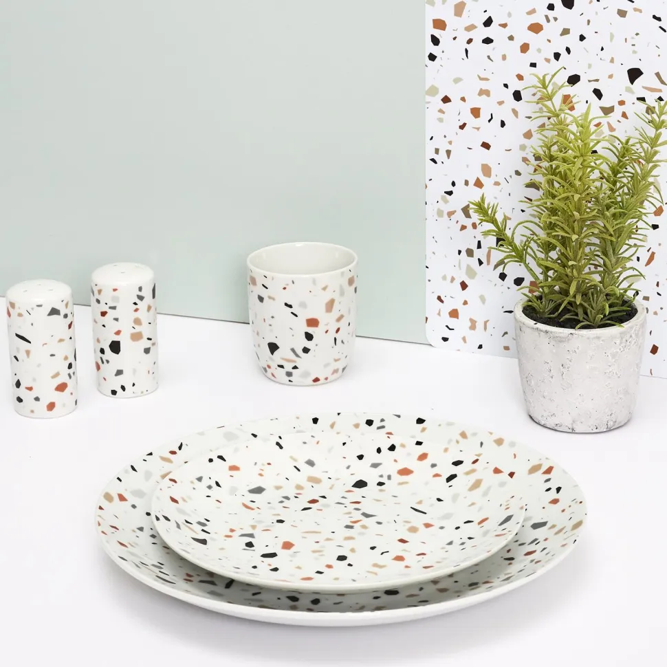 Zadbaj o to, by w Twoim mieszkaniu nawet przedmioty codziennego użytku posiadały przemyślany design. Drobny dodatek w postaci solniczki i pieprzniczki ze wzorem terazzo lastriko może odmienić aranżację stołu w jadalni czy blatu w kuchni. Ten gorący trend w postaci lastriko to wysmakowane połączenie kolorów i kształtów, które sprawia, że wnętrze jest bardziej przytulne i odbierane pozytywnie. Zestaw pojemników na sól i pieprz to porcelanowe naczynia w kolorze białym z pastelowymi akcentami. Poza nimi w serii znajdziesz także talerze i kubki, które wspólnie stworzą urokliwą kompozycję.