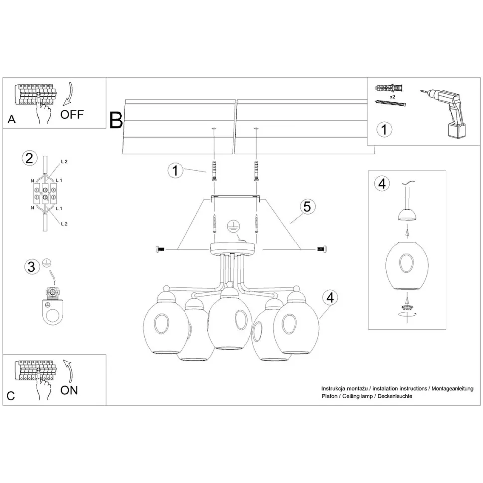- Pozwala na zastosowanie pięciu żarówek typu E27, dzięki czemu można dostosować moc i barwę światła do indywidualnych potrzeb.