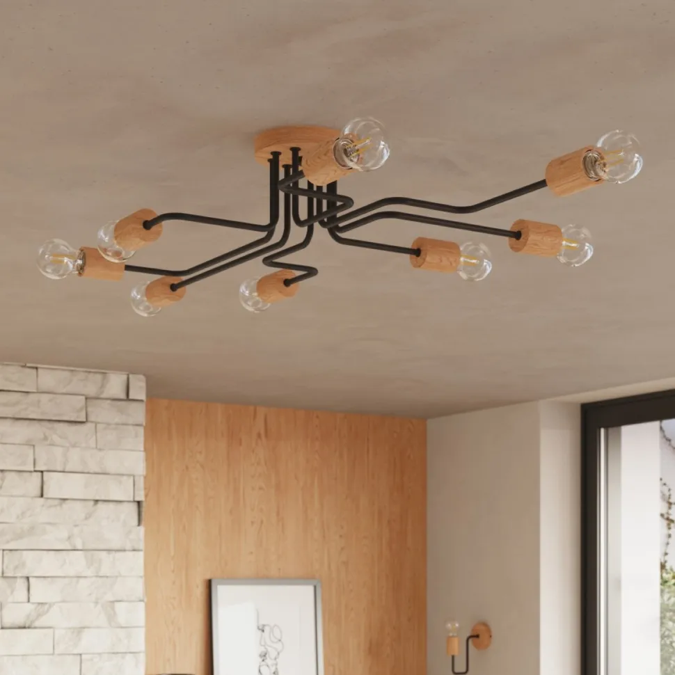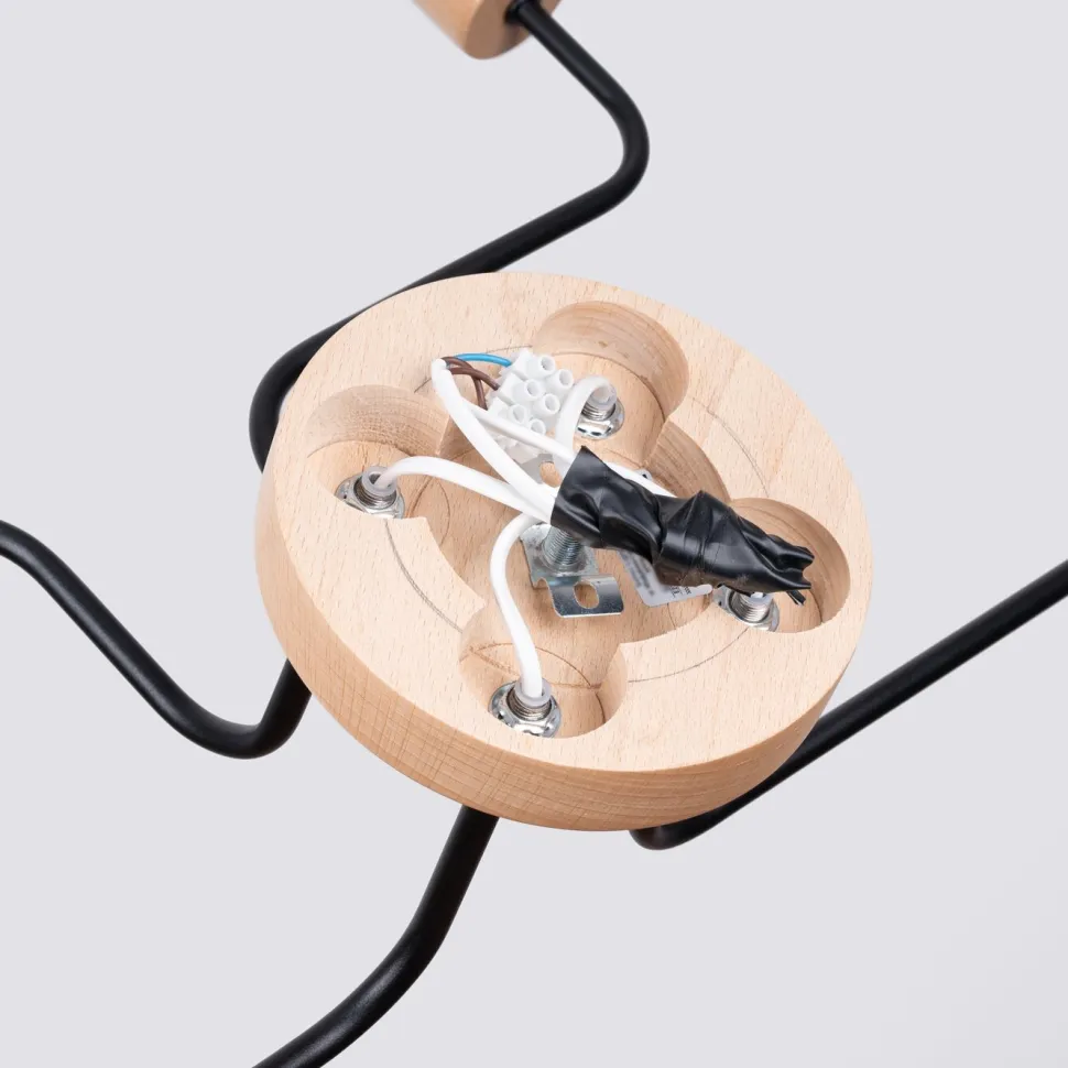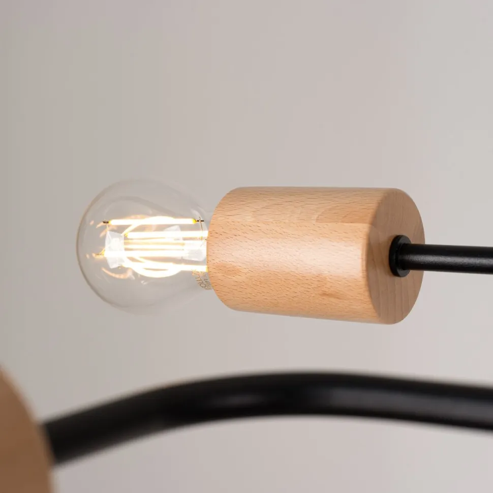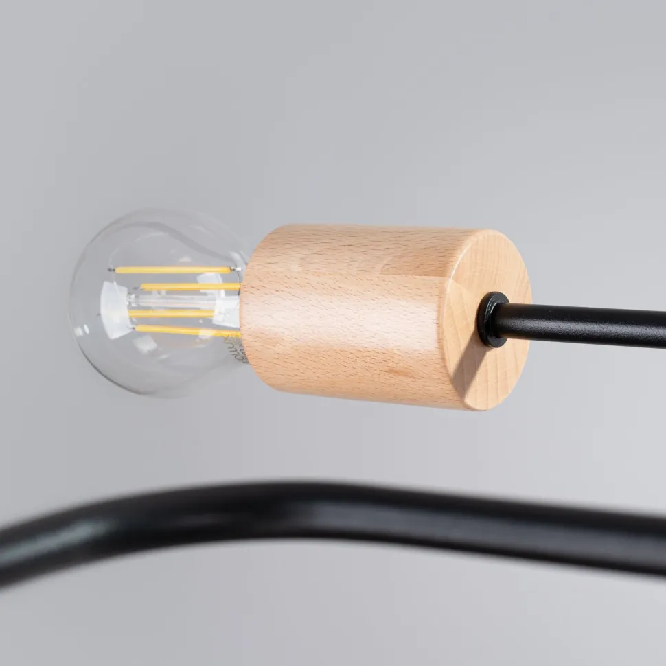 Czarny kolor żyrandola TIMBO 4 dodaje elegancji i stylu każdemu wnętrzu. Jest uniwersalny i łatwo dopasowuje się do różnych kolorów i stylów aranżacji. Dodatkowo, połączenie czerni z naturalnym kolorem drewna tworzy ciekawy kontrast, który przyciąga wzrok.