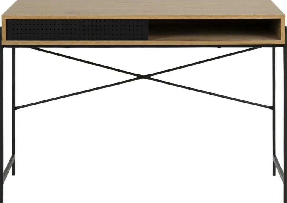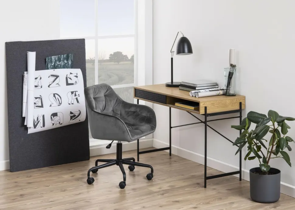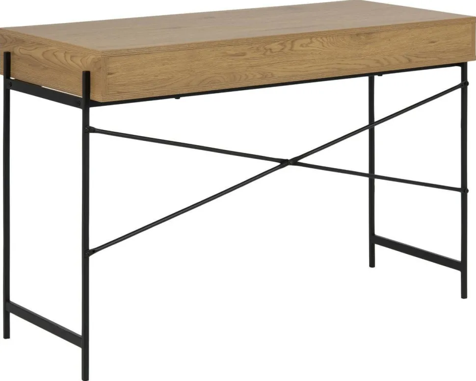 Styl industrialny wciąż jest jednym z najbardziej popularnych aranżacji w ostatnim czasie. Jego surowość, estetyka i ergonomia to cechy, które w połączeniu z niepowtarzalnym wyposażeniem tworzą wyjątkowy klimat, jaki uwielbiamy. Duch fabryki zamknięty w minimalistycznych meblach o uwydatnionej konstrukcji to obowiązkowy element takiej przestrzeni. Kolekcja Angus producenta Actona to meble, które w subtelny i nieprzesadzony sposób podkreślą charakter industrialny każdego mieszkania. ANGUS DĄB to kompaktowe biurko, które może być idealnym meblem do biura lub pokoju nastolatka. Blat o głębokości 50 cm zrobiony został z płyty MDF w okleinie imitującej drewno dębu. Pod blatem znajduje się ukryta półka, którą osłania ażurowy, przesuwny front wykonany z tego samego materiału. Skrzynia opiera się na metalowej delikatnej konstrukcji malowanej proszkowo na czarno, która sprawia, że biurko wydaje się być drobne i lekkie, a tym samym estetycznie wygląda we wnętrzu. Dodatkowe, krzyżujące się wsporniki są nie tylko swoistą ozdobą, ale również stabilizują mebel. Typowo industrialne połączenie faktur i materiałów świetnie wpisze się w przestrzeń domowego biura, pokoju nastolatka lub kreatywnego gabinetu. Aby ujednolicić swoje wnętrze, wykorzystaj także inne meble z wyjątkowej kolekcji Angus.