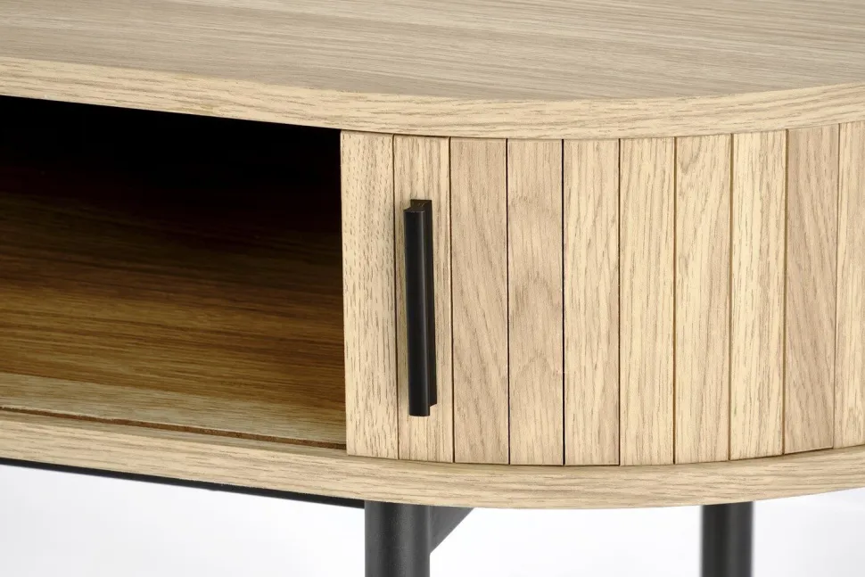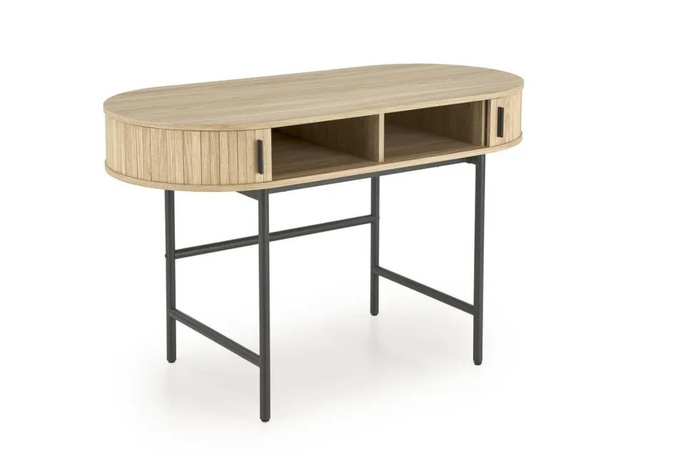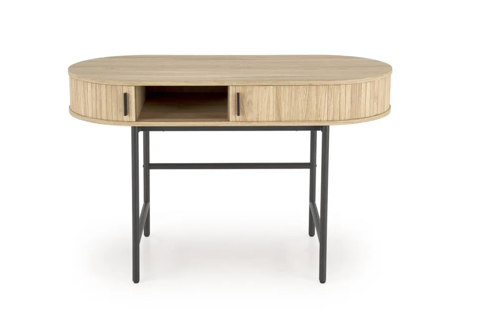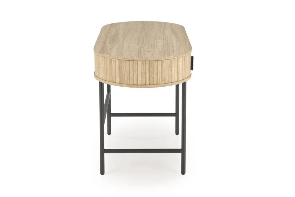 Biurko Bahli w naturalnym wykończeniu z czarnymi nogami to elegancki i funkcjonalny mebel, który doskonale wpisuje się w nowoczesne wnętrza. Charakteryzuje się solidną konstrukcją wykonaną z MDF okleinowanego, co zapewnia estetyczny wygląd oraz trwałość. Stal malowana proszkowo nadaje mu stabilność i odporność na uszkodzenia mechaniczne.