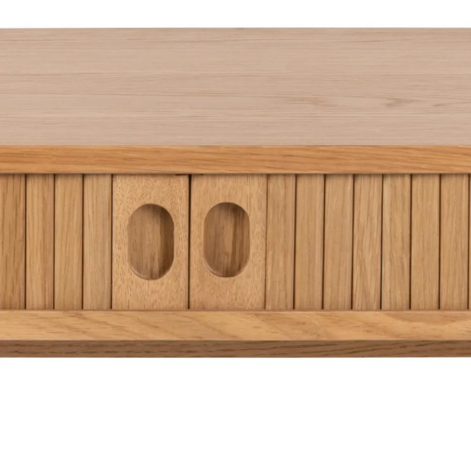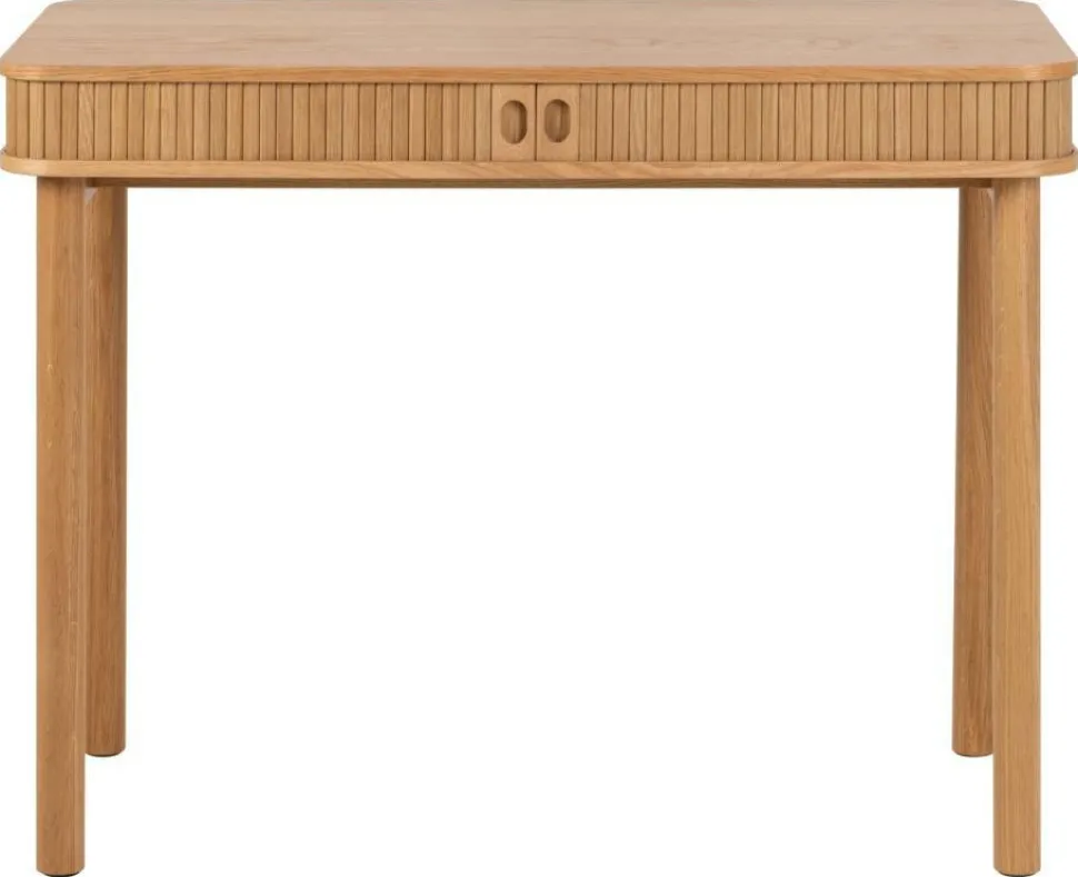 Biurko Langley dąb wyróżnia się również dekoracyjną listwą, która uwydatnia teksturę drewna. Prostokątny korpus z fornirem dębowym i zaokrąglonymi narożnikami dodaje elegancji i stylu. Drzwi żaluzjowe nadają mu nowoczesnego charakteru, a lakierowane wykończenie zapewnia naturalne wrażenie. To biurko zostało wykonane z wysokiej jakości materiałów. Blat z MDF został wykończony fornirem dębowym, który jest lakierowany, co nadaje mu eleganckiego wyglądu. Drzwi z MFDF również pokryte są fornirem dębowym i lakierowane NC, a podstawa biurka wykonana jest z lakierowanego dębu.