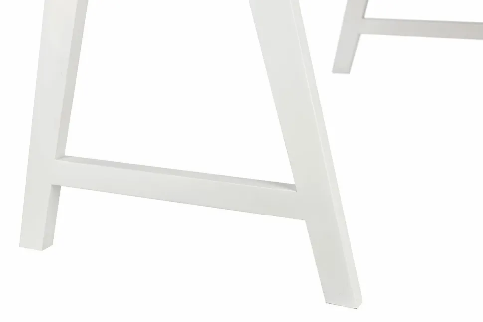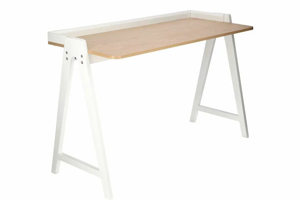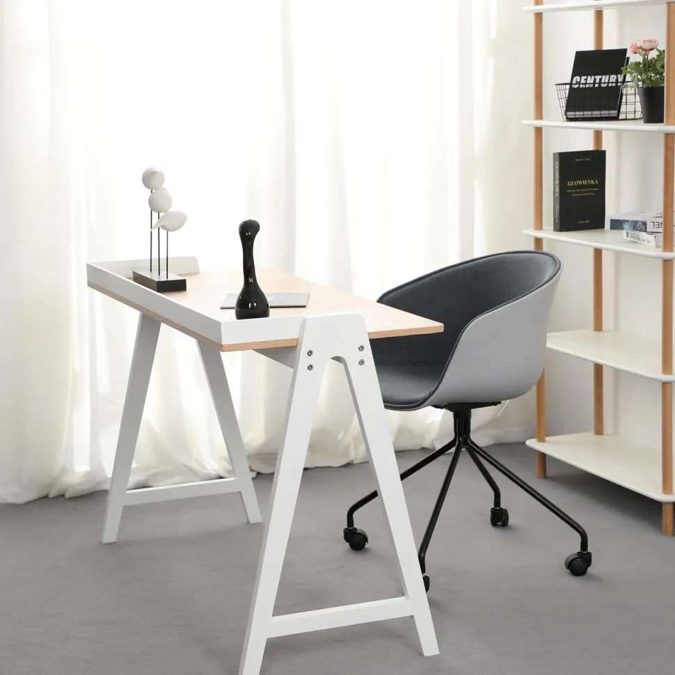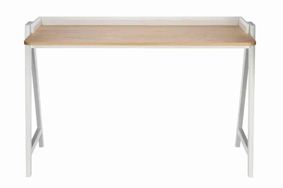 Nogi biurka ułożone w kształt litery A zapewniają wysokie poziom stabilności oraz stanowią wyjątkowy element wizualny. Charakterystyczną cechą biurka są także zaokrąglone rogi blatu.