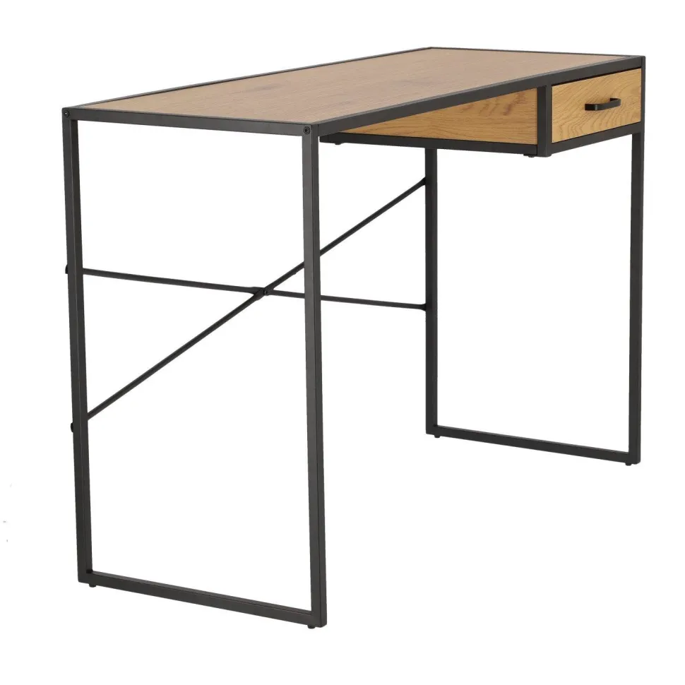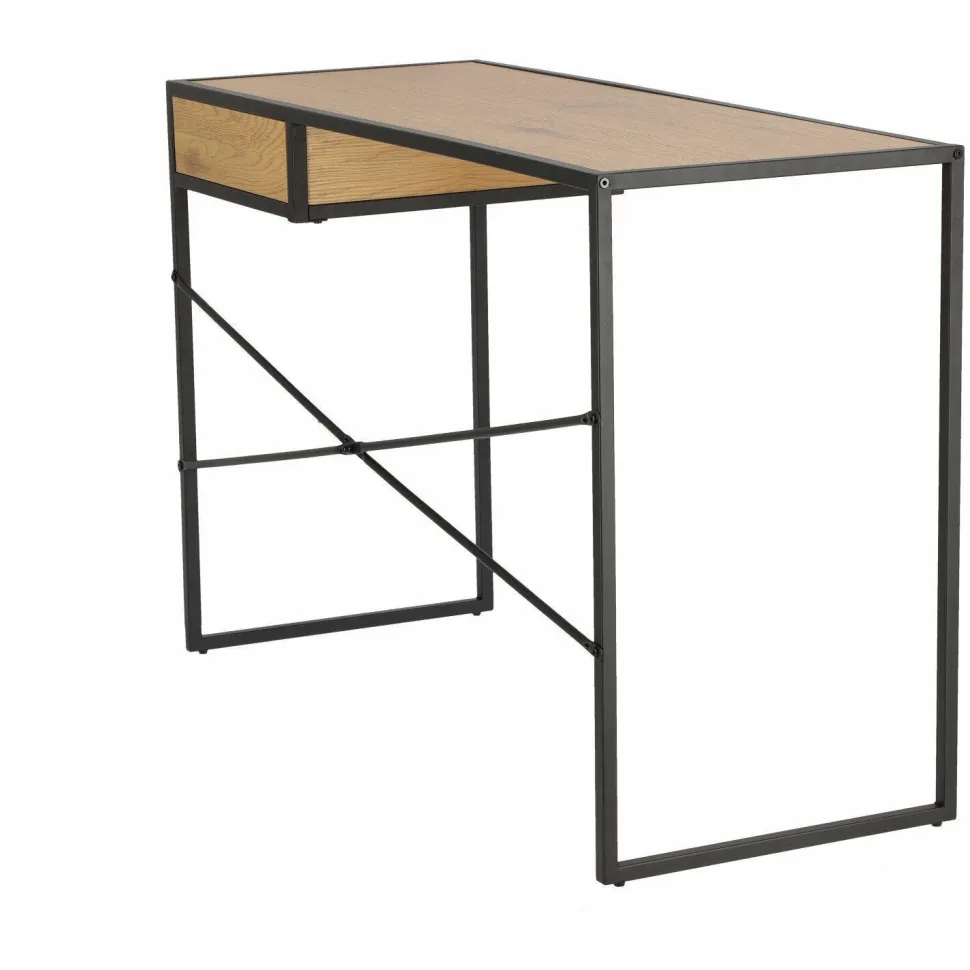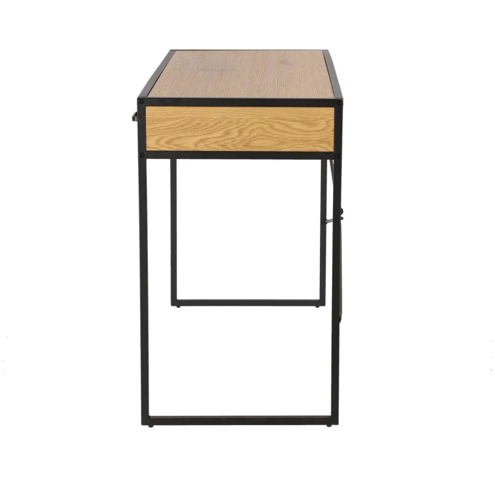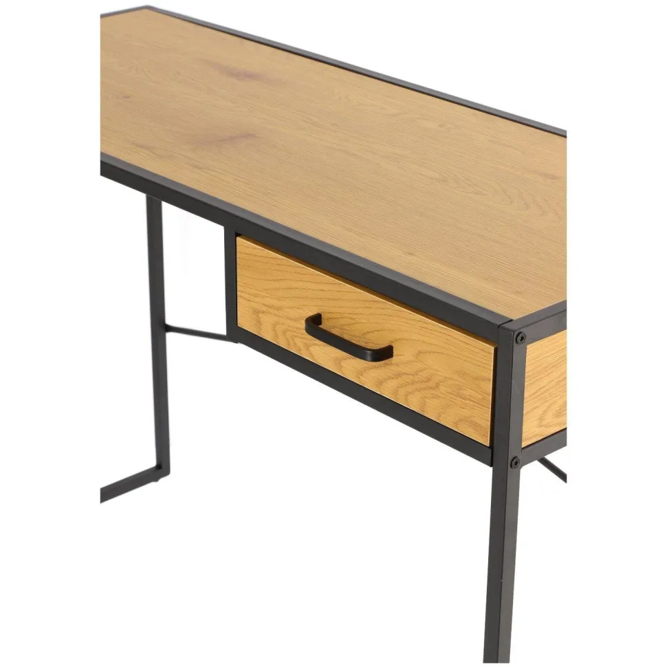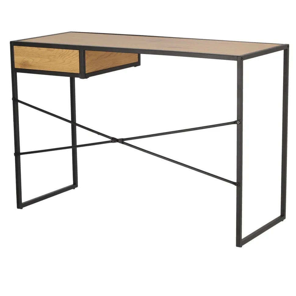 Biurko Oxford wykonane zostało z metalu malowanego proszkowo na kolor czarny oraz płyty MDF wykończonej laminatem w kolorze dębu.