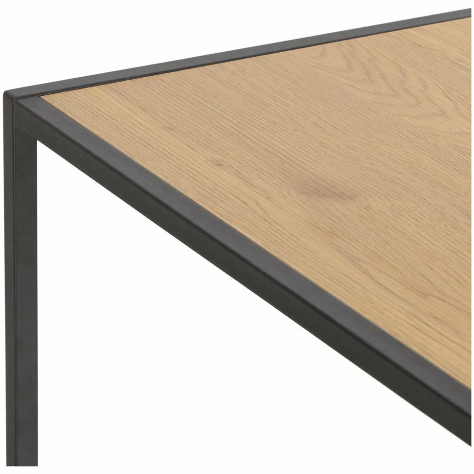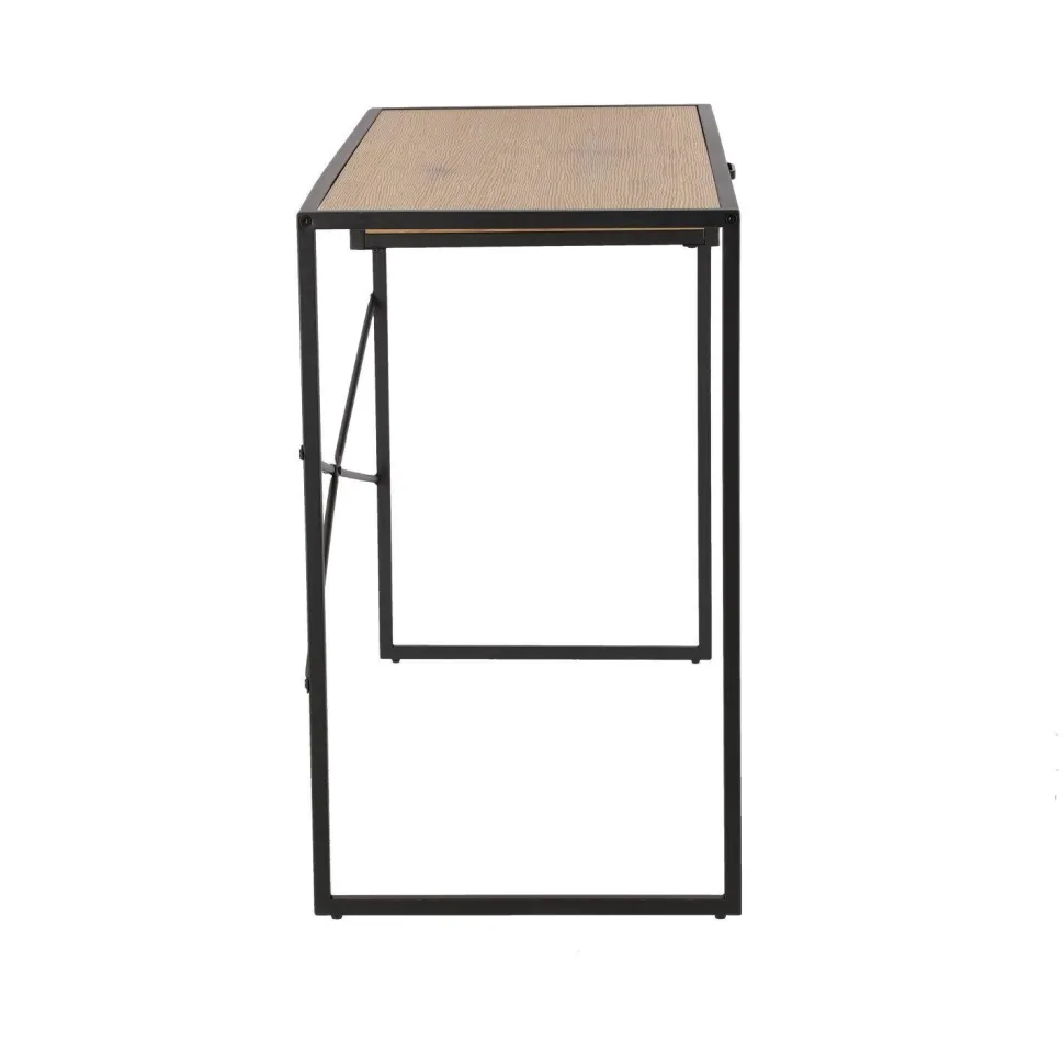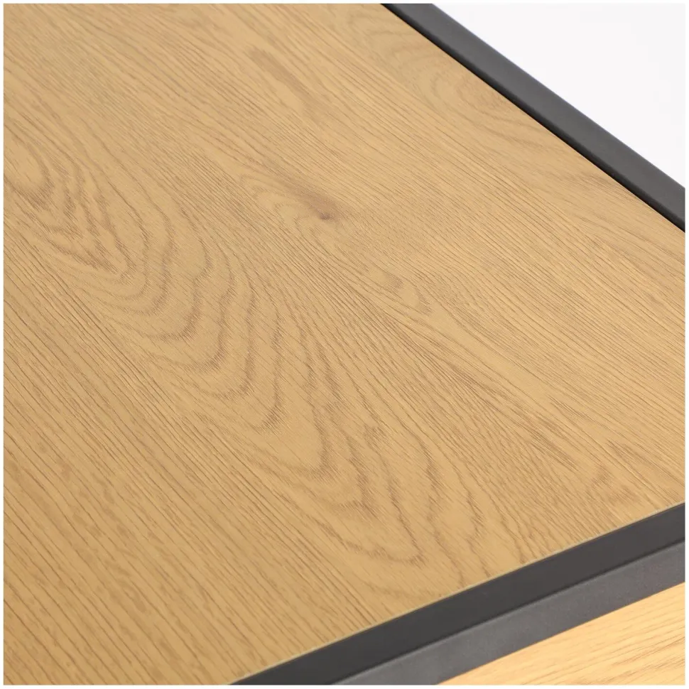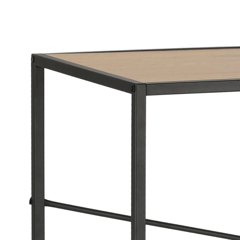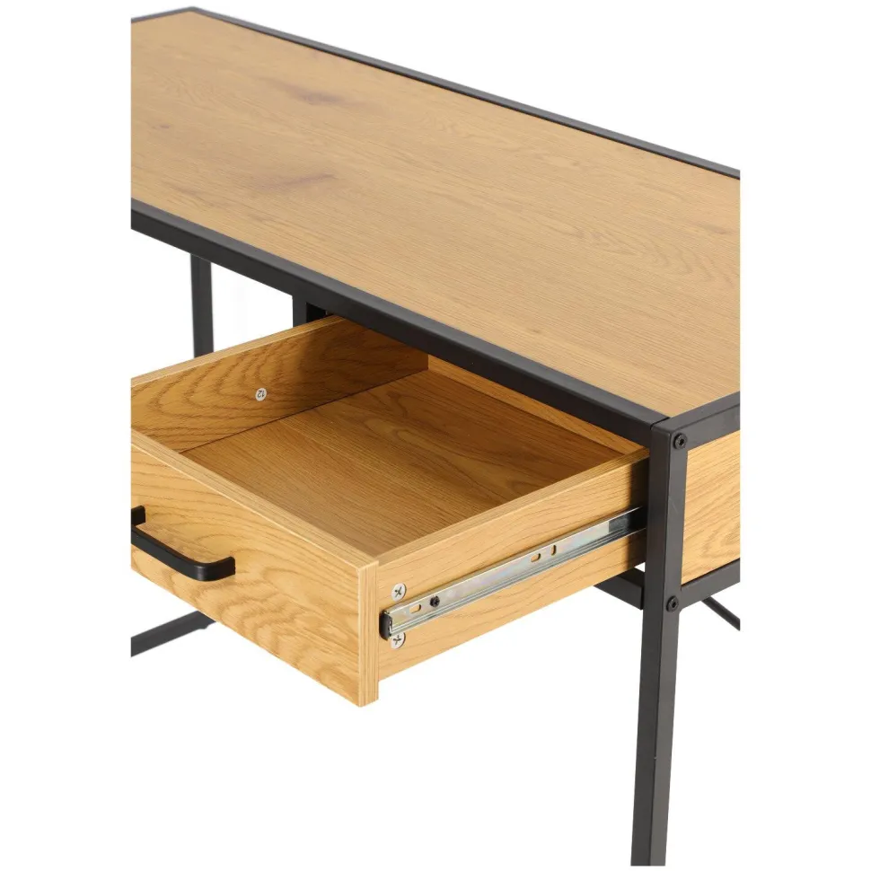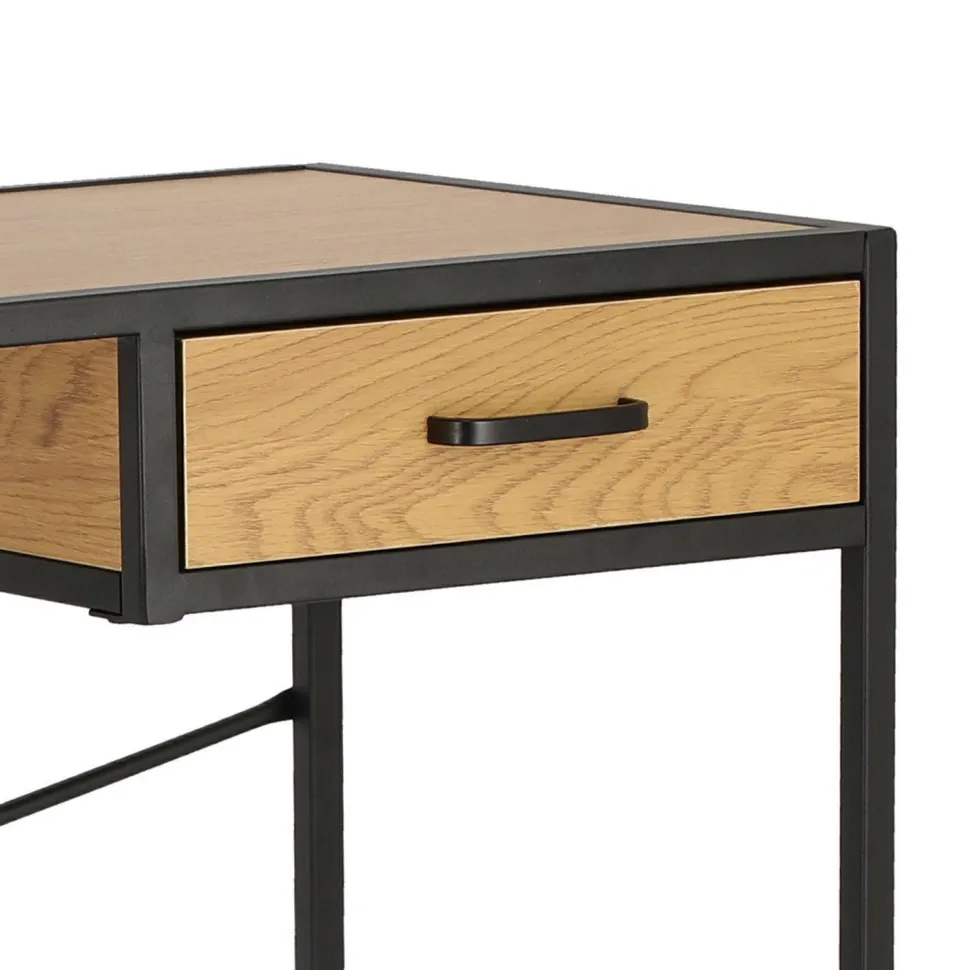 Biurko Oxford wykonane zostało z metalu malowanego proszkowo na kolor czarny oraz płyty MDF wykończonej laminatem w kolorze dębu.