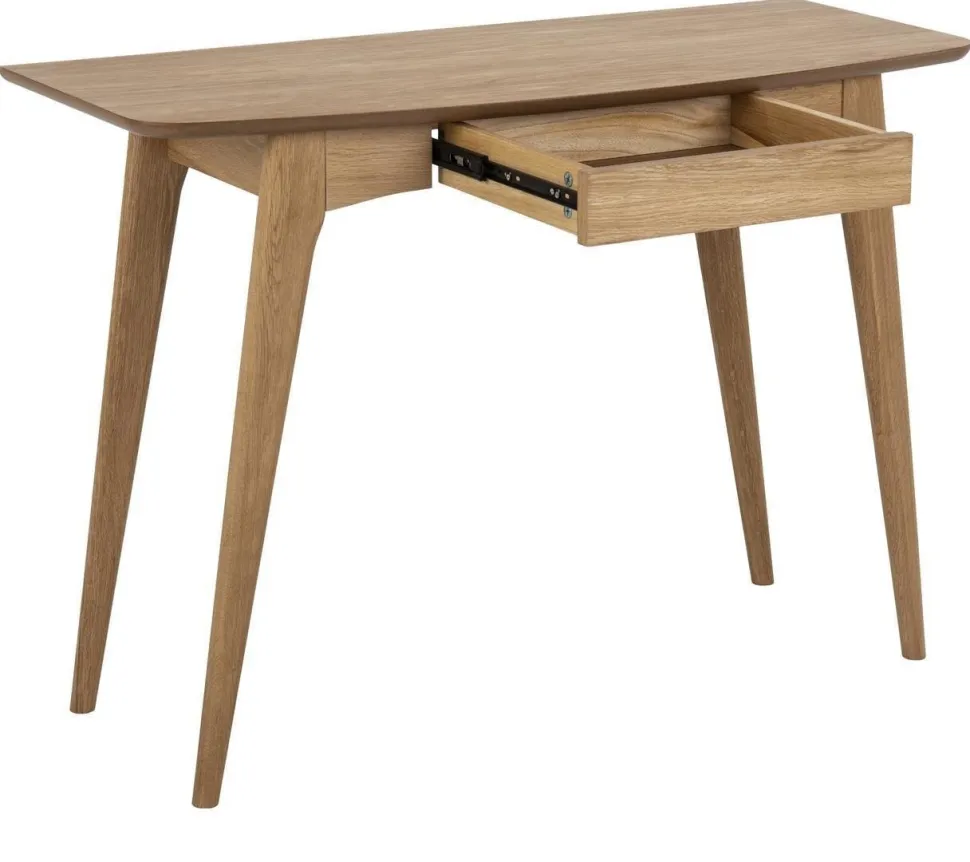 Podstawą biurka są wysokie, lekko skośne nogi z litego drewna dębowego. Podtrzymują one prostokątny, szeroki blat, którego dolna część wyposażona została w pojemną szufladkę, doskonałą do trzymania w niej potrzebnych Ci akcesoriów.