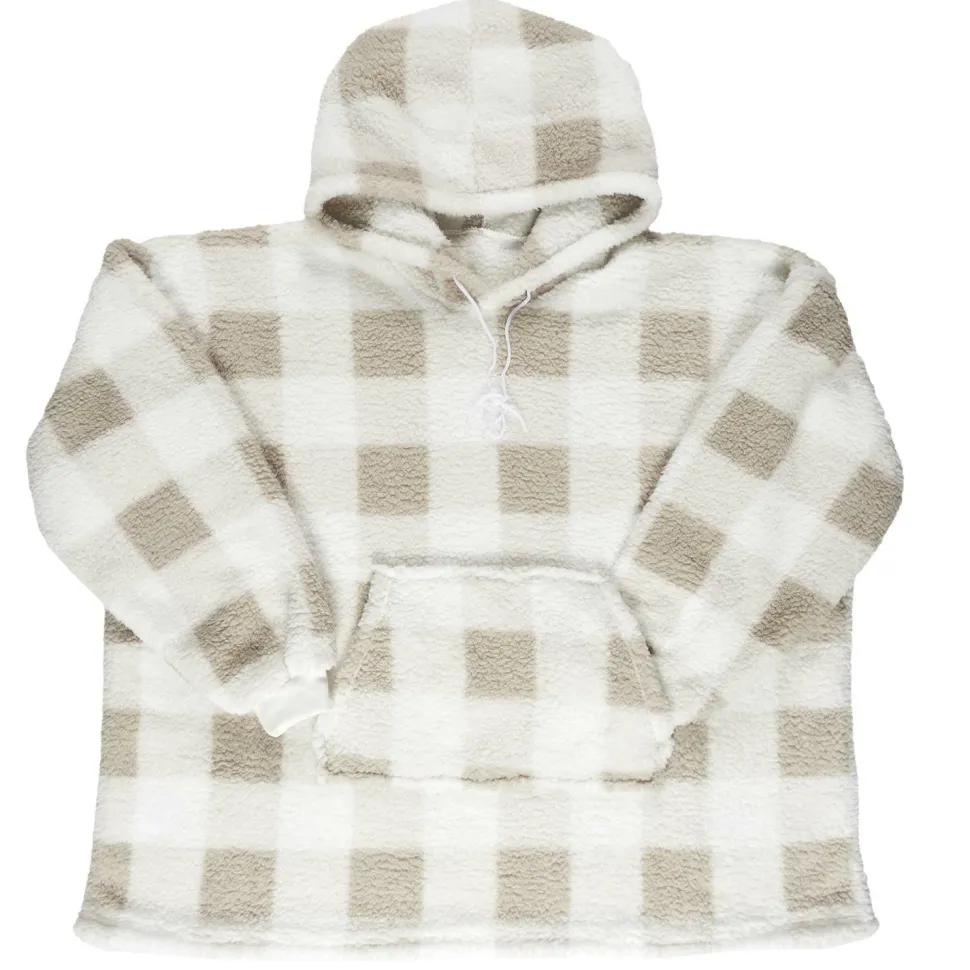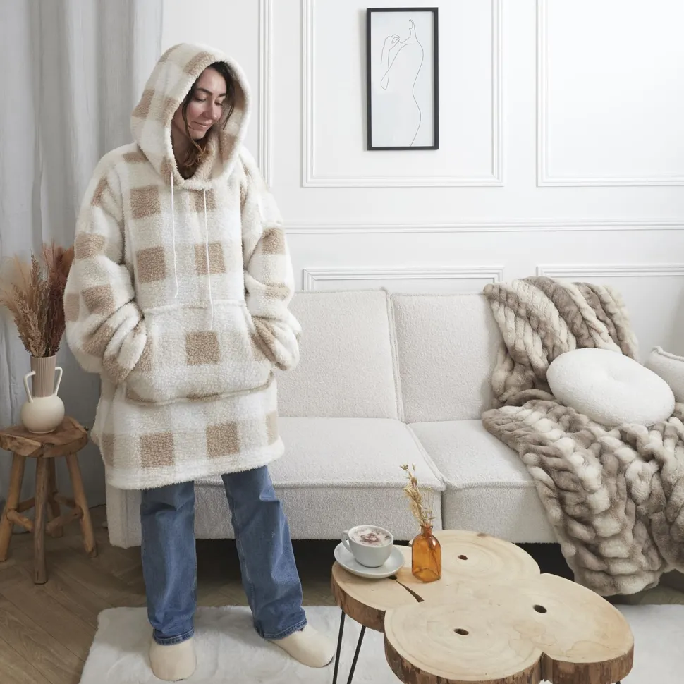 Niezwykle miękka i ciepła bluza ocieplana długa snuddie w kratę beżowo-biała to doskonały wybór na chłodne dni i wieczory. Wykonana z wysokiej jakości poliestru, który jest nie tylko miły w dotyku, ale także zapewnia doskonałe właściwości termiczne. Przyjemny beżowy kolor z białą kratą doda uroku każdemu wnętrzu. Bluza jest długa, dzięki czemu doskonale otula ciało, a kaptur ze ściągaczem zwiększa komfort użytkowania. Dodatkowo, bluza posiada praktyczną kieszeń z przodu, w której można schować drobiazgi. Idealna do noszenia podczas oglądania filmów, czytania książki czy po prostu relaksu na kanapie.