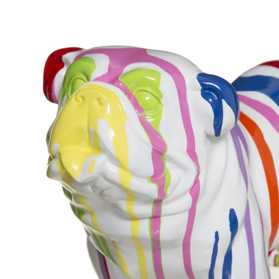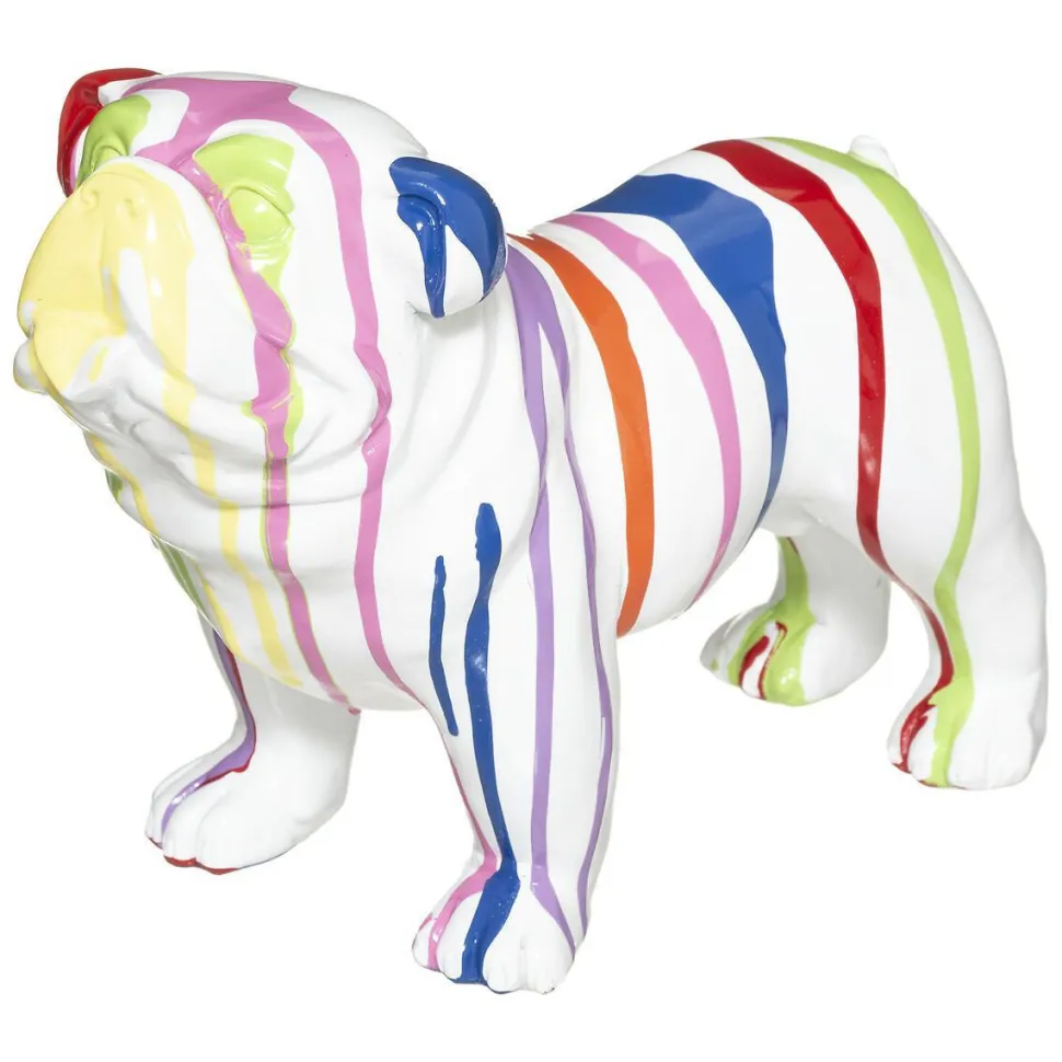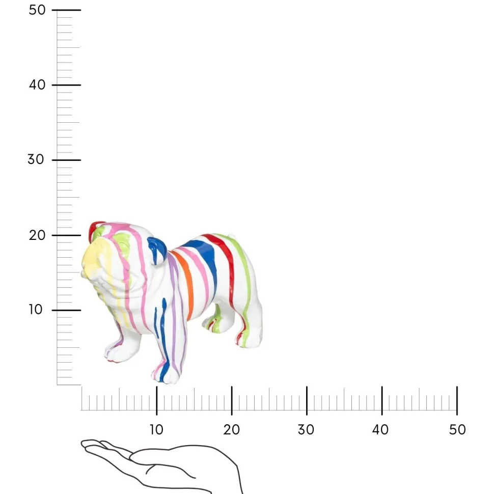 Dekoracja w kształcie buldoga angielskiego to świetny sposób na dodanie charakteru do Twojego domu. Plastikowa figurka w białym kolorze ma kolorowe smugi, które dodadzą eklektycznego akcentu w Twoim wnętrzu. To idealny dodatek do nudnej szafki RTV lub konsoli w przedpokoju.