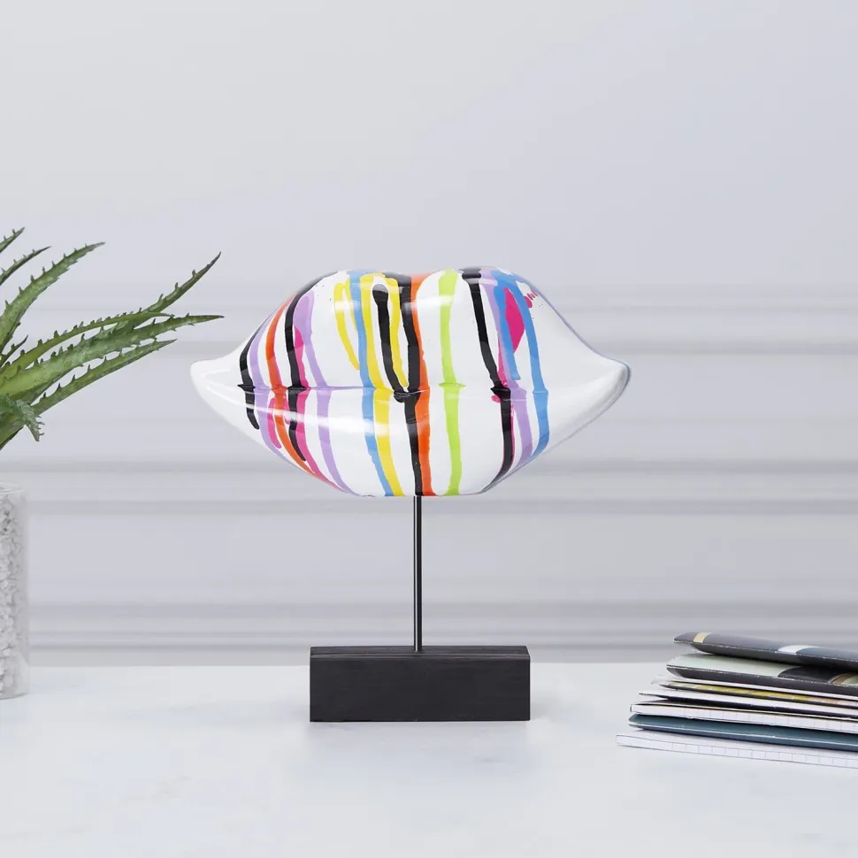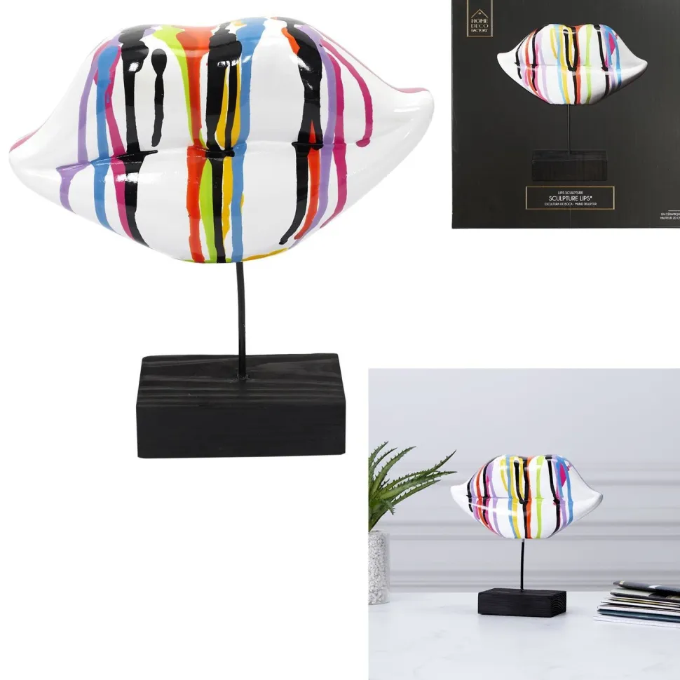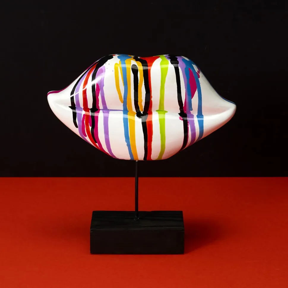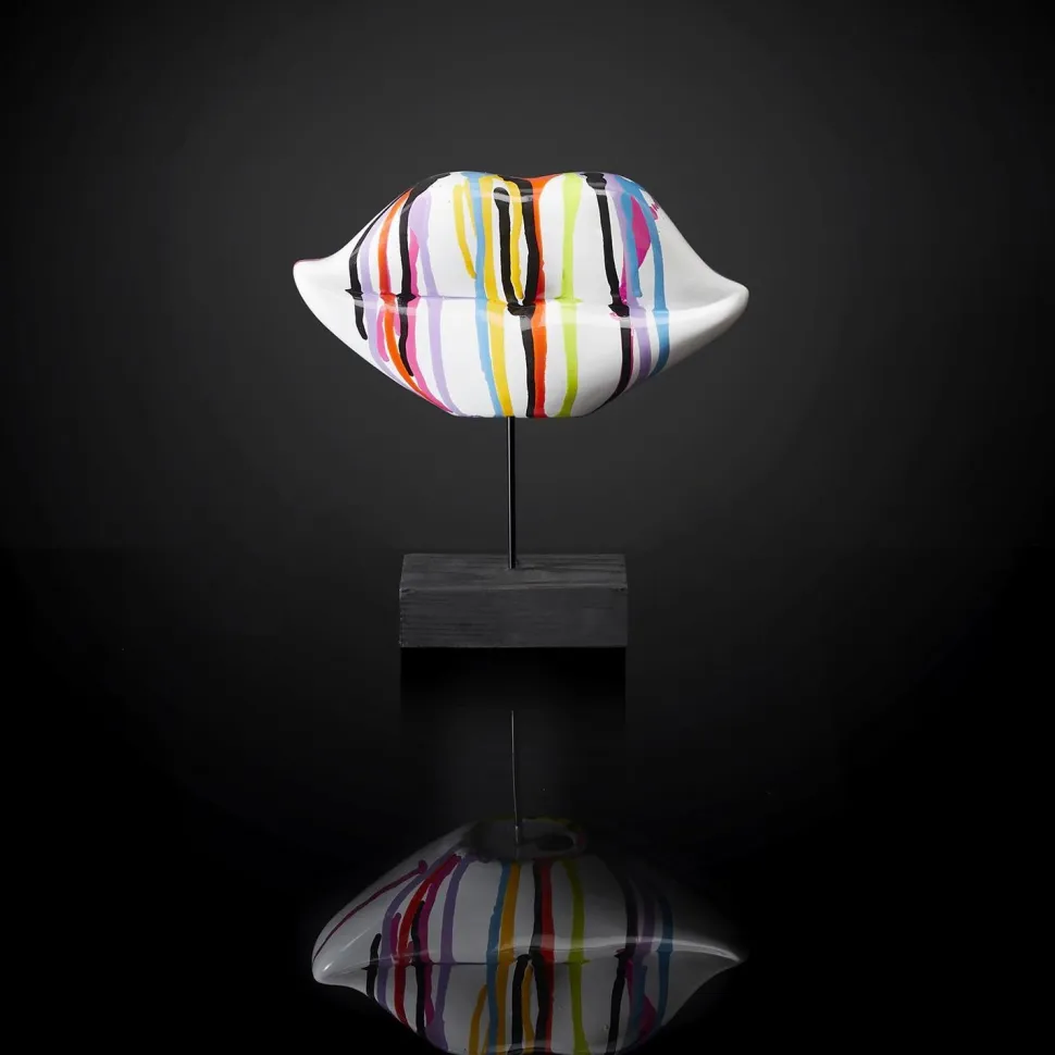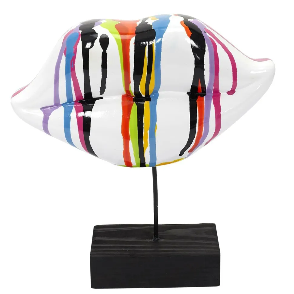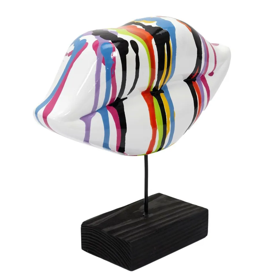 Dekoracja usta to ozdoba, która wyraża więcej niż tysiąc słów. Jeśli uwielbiasz odważne dodatki z charakterem z pewnością przypadnie Ci do gustu dekoracja Usta. Usta ozdobione zostały swobodnie spływającą farbą w różnych kolorach. Całość prezentuje się bardzo pop-artowo. Dekoracja została zrobiona z ceramiki połączonej z drewnianą podstawą metalowym wspornikiem. To doskonałe uzupełnienie nowoczesnych wnętrz, które w świetny sposób skomponuje się z aranżacjami pełnymi kolorów.