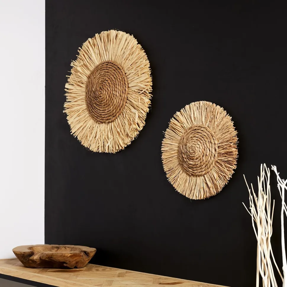 Dodaj odrobinę stylu boho do swojego domu dzięki tym naturalnym dekoracjom z rafii. Te okrągłe, plecione dekoracje są dostępne w dwóch rozmiarach i są idealnym dodatkiem do każdego pomieszczenia, w którym panuje relaksujący, naturalny klimat.